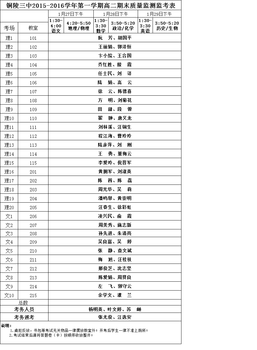 高一、高二年級(jí)期末質(zhì)量監(jiān)測(cè)監(jiān)考安排如下: