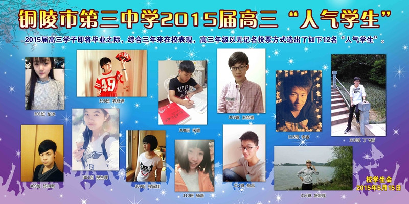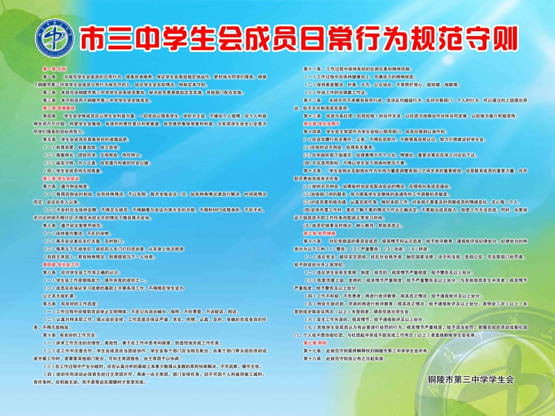 銅陵市第三中學(xué)學(xué)生會是在校團(tuán)委和政教處的指導(dǎo)下,秉承“身體健康,心理陽光,學(xué)業(yè)進(jìn)步”的12字辦學(xué)目標(biāo),緊緊團(tuán)結(jié)全校學(xué)生,獨(dú)立開展工作的先進(jìn)學(xué)生組織,是實(shí)現(xiàn)學(xué)生“自我服務(wù)、自我管理、自我教育和自我成長”的溫馨之家。