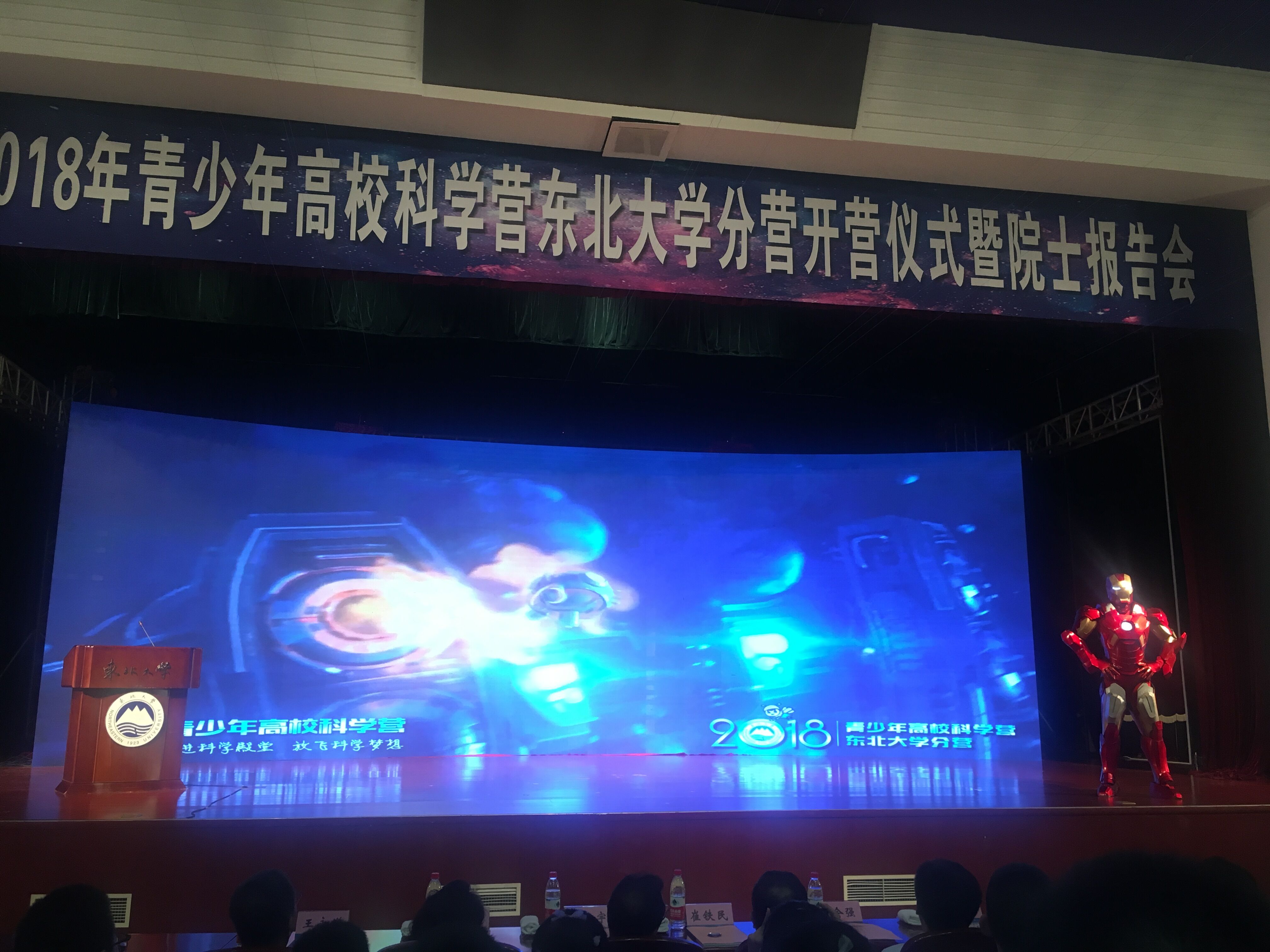 今年是東北大學承辦科學營的第七個年頭,同時也恰逢建校95周年,為了以更好更新的風貌迎接科學營和營員師生,為校慶獻禮,本屆科學營對主題與活動進行了全新設計與呈現(xiàn),主題確定為"NEU YOUTH PIONEER"少年先鋒領航派。在開營儀式上由神秘嘉賓“鋼鐵俠”登場介紹整體活動方案,“鋼鐵俠”對日程安排、前期籌備及活動意義等方面詳細介紹了本次活動,讓在場的同學們都大開眼界。我校凌天驄同學作為200名營員的唯一代表在開營儀式上做了發(fā)言,他號召同學們珍惜寶貴的學習機會,用心去參與和感受,多思、多想、多問,認真完成各項學習、實踐任務,不虛此行,滿載而歸。