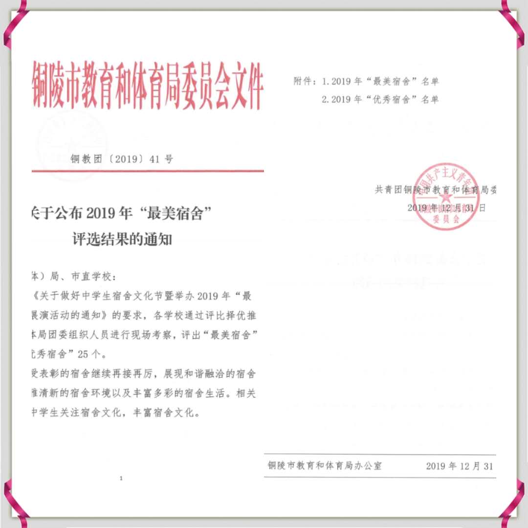 近期,評選結(jié)果揭曉:我校401、502、503三個宿舍榮獲2019年度“最美宿舍”榮譽稱號,高三年級女生團體榮獲2019年度“優(yōu)秀宿舍”榮譽稱號。