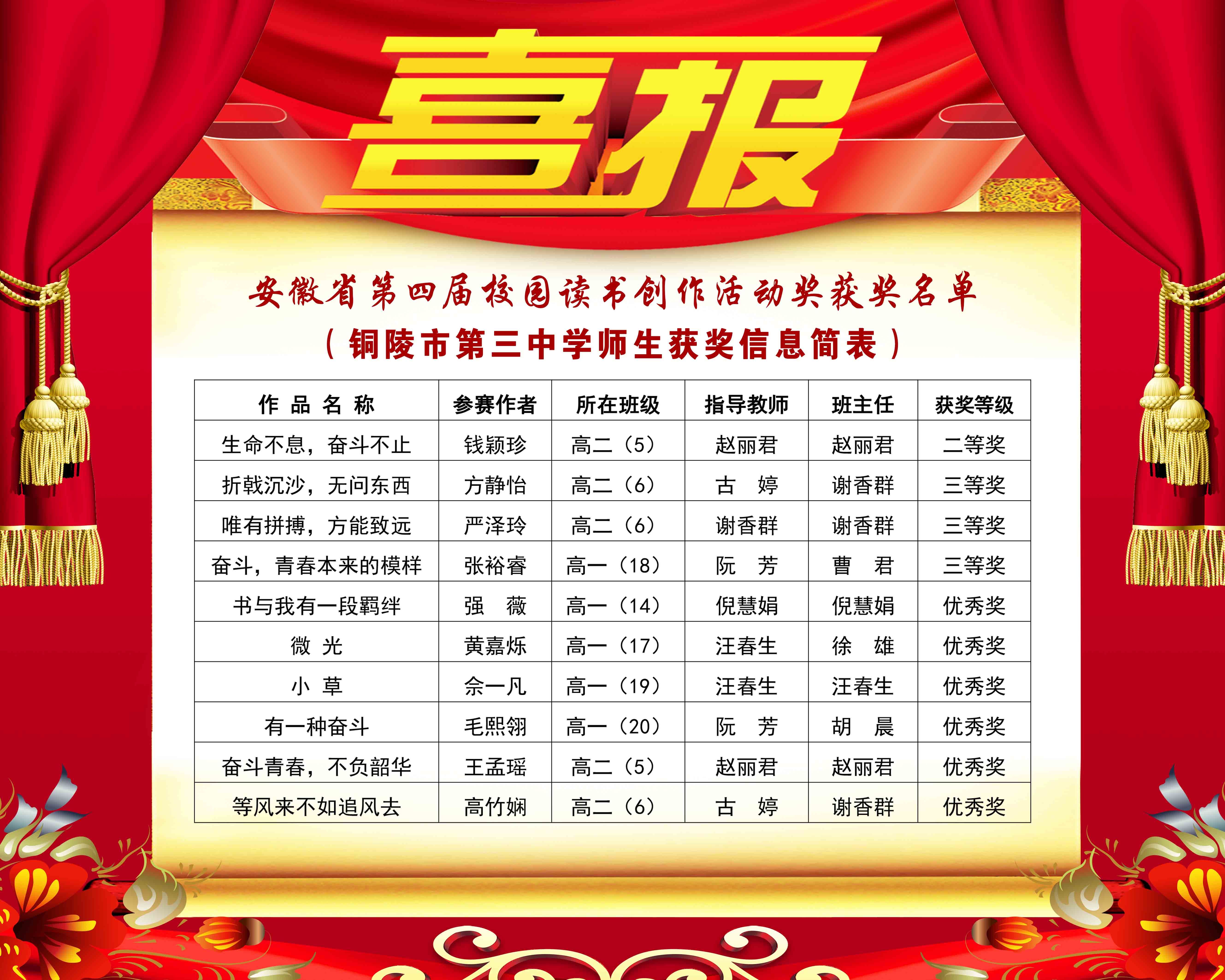 為深入落實(shí)習(xí)近平總書(shū)記關(guān)于教育的重要論述,培育社會(huì)主義核心價(jià)值觀(guān),弘揚(yáng)中華優(yōu)秀傳統(tǒng)文化,落實(shí)立德樹(shù)人根本任務(wù)。安徽省第四屆校園讀書(shū)創(chuàng)作活動(dòng)盛大舉行。活動(dòng)由中共安徽省委教育工委、安徽省教育廳、安徽省人力資源和社會(huì)保障廳、安徽省文化和旅游廳、安徽省新聞出版局、共青團(tuán)安徽省委員會(huì)等單位聯(lián)合主辦。本屆讀書(shū)創(chuàng)作活動(dòng)宗旨是:讀書(shū)引領(lǐng)人生,創(chuàng)作點(diǎn)亮夢(mèng)想。活動(dòng)主題是:奮斗,永恒的旋律。我校師生在安徽省第四屆校園讀書(shū)創(chuàng)作活動(dòng)中喜獲佳績(jī)。