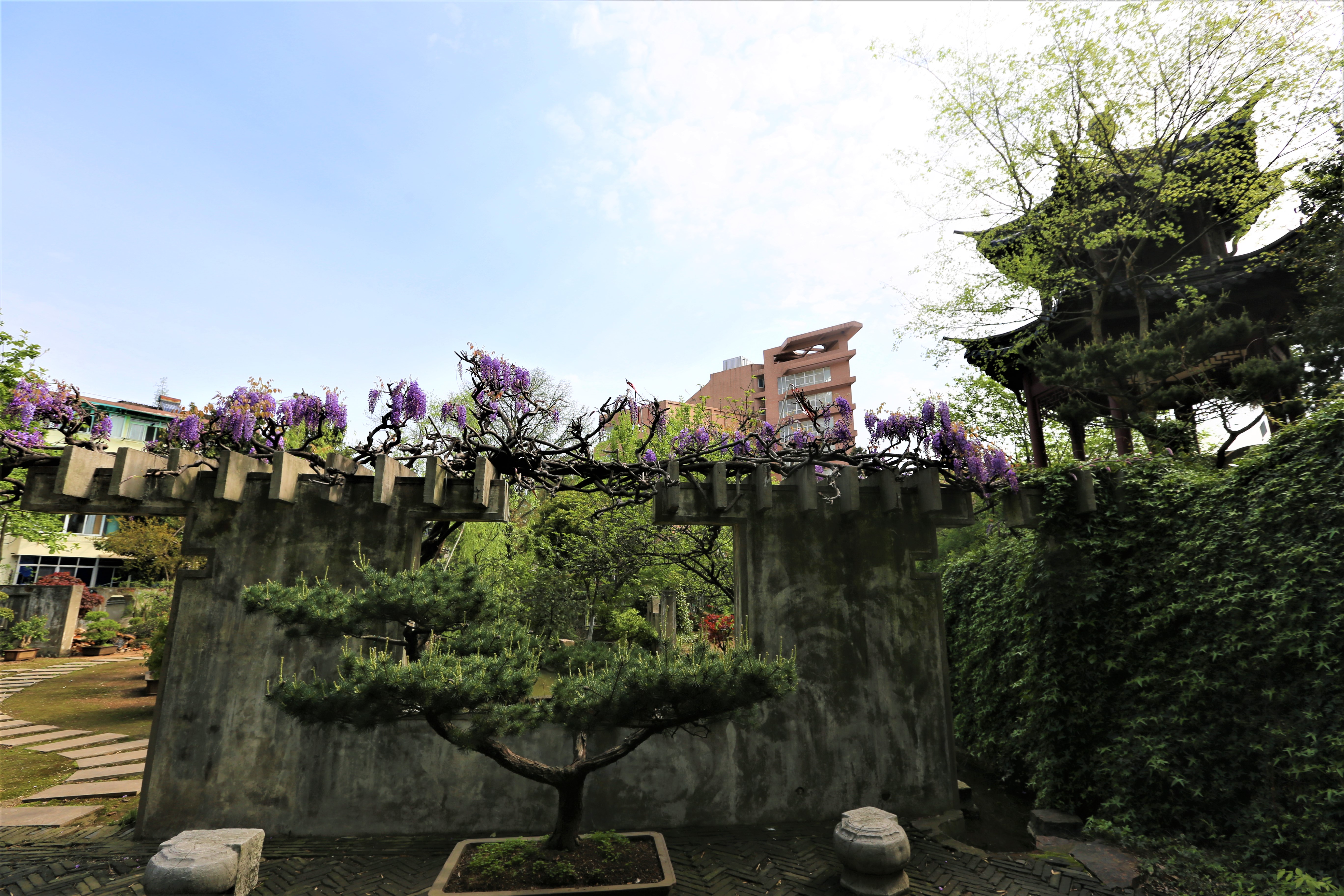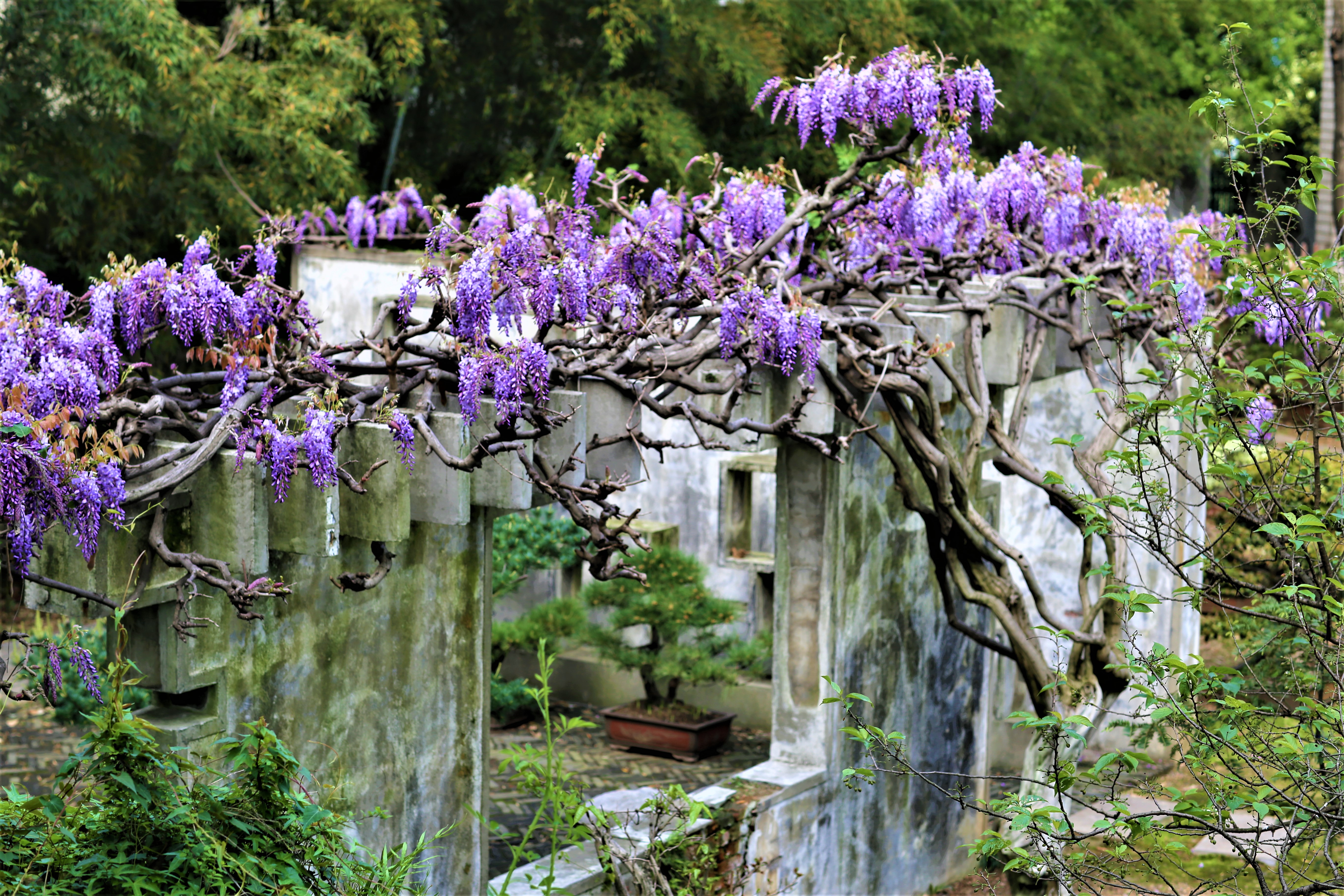 四月,正是紫藤花開季節(jié),三中的紫藤花主要分布在三處,一是生態(tài)館樓頂處,二是植物園長廊,三是植物園盆景園,其中,盆景園的紫藤樹樹齡已經(jīng)有200多年,賞紫藤花,必到三中這三地打卡,三中的紫藤花分時而開,階梯式凋落,四月初,蔓延蜿蜒的藤條上朵朵花開,隨風似紫色波浪般搖擺,一片夢幻的海洋,像畫非畫,如夢非夢,花香沉醉,讓人流連忘返……