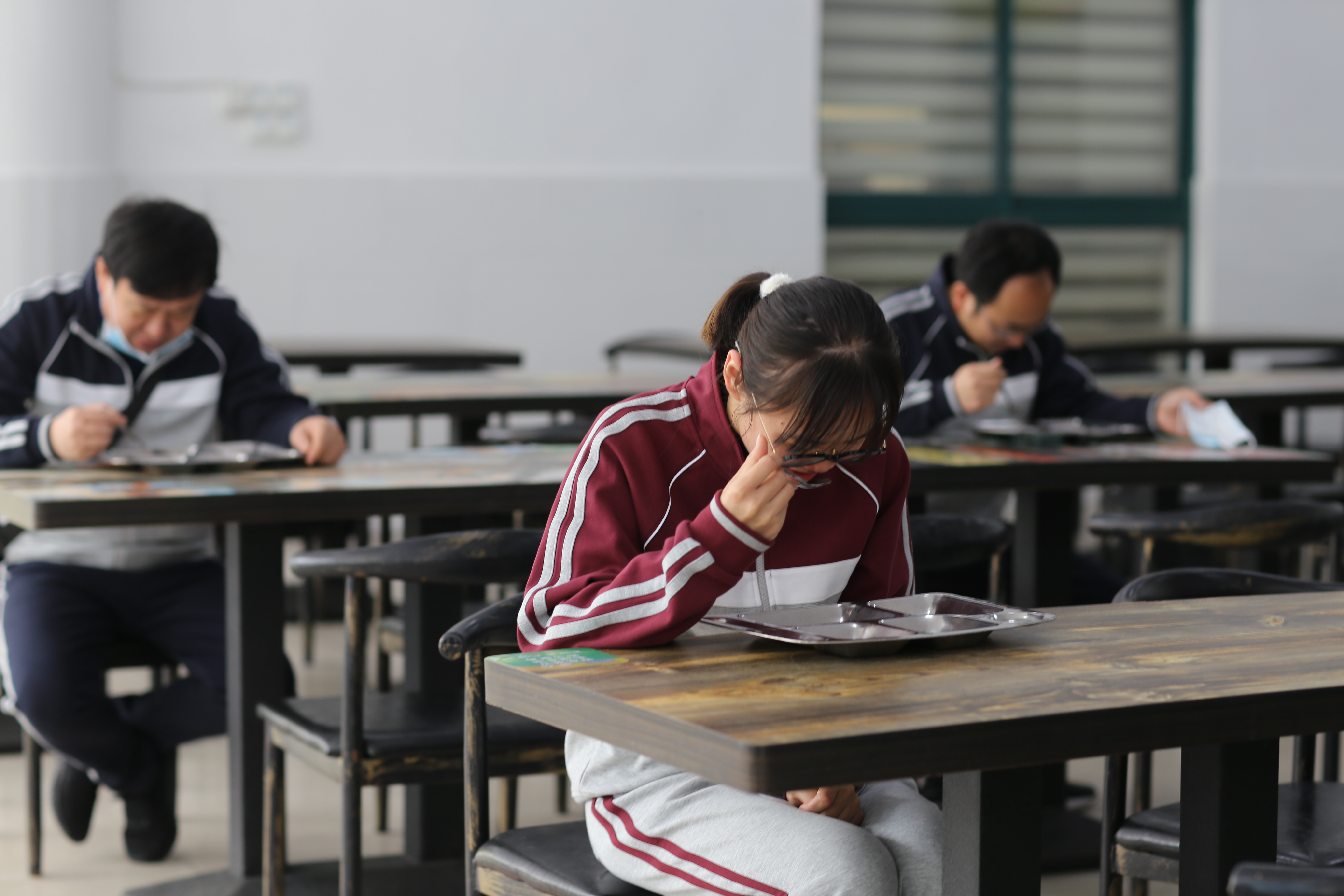 在食堂候餐時(shí),師生佩戴口罩,排隊(duì)取餐,間隔1米以上,就餐人員分散、同向就座,用餐中不交流,用餐完畢后立即佩戴口罩離開(kāi)食堂。