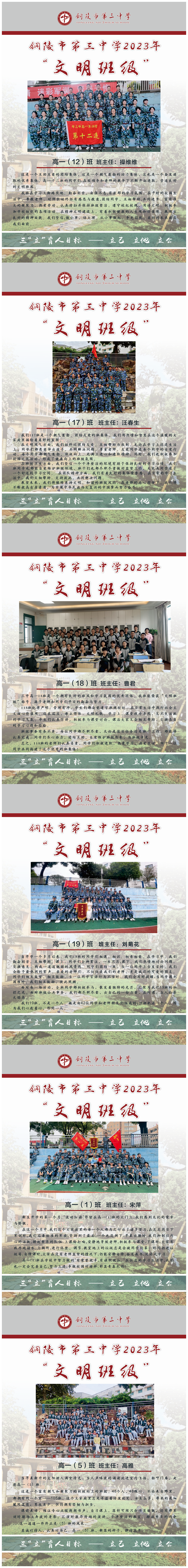 為深入學(xué)習(xí)黨的二十大精神,推進(jìn)主題教育走深走實(shí),2023年作為我校教育教學(xué)質(zhì)量提升年,我校堅(jiān)持“立德樹人”根本任務(wù),深入落實(shí)三“立”育人目標(biāo)——立己、立他、立公,將每年九月定為“行為規(guī)范養(yǎng)成”主題月,開展系列主題教育活動(dòng),促使學(xué)生養(yǎng)成愛黨愛國(guó)、明禮誠(chéng)信、厚德善行的良好行為習(xí)慣,F(xiàn)對(duì)本次活動(dòng)中表現(xiàn)優(yōu)秀的班級(jí)和學(xué)生進(jìn)行表彰,授予以下班級(jí)“文明班級(jí)”榮譽(yù)稱號(hào)、以下同學(xué)“大立青年”榮譽(yù)稱號(hào)。