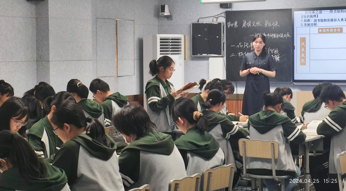 為展現(xiàn)實習(xí)生們教學(xué)成果,先由朱子言和楊宇琦兩位實習(xí)生開展公開課,安徽師范大學(xué)施才玉院長、王彥章教授與江琴教授率研究生們和歷史組教師一起聽課。