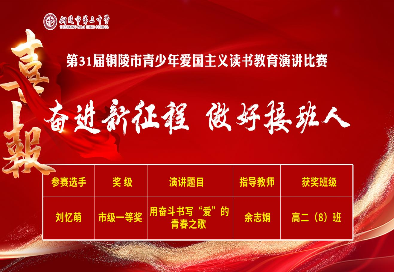 時代風(fēng)云起,青年踏歌行;神州蓬勃勢,莫做袖手人。為教育引導(dǎo)廣大青少年學(xué)生堅定聽黨話、跟黨走,努力成為擔(dān)當(dāng)強(qiáng)國建設(shè)、民族復(fù)興大任的時代新人。6月19日,銅陵市青少年愛國主義讀書教育活動組委會在市電視臺演播大廳舉行第31屆銅陵市青少年“奮進(jìn)新征程,做好接班人”愛國主義讀書教育演講比賽,我校高二(8)班劉憶萌同學(xué)喜獲一等獎的好成績,可圈可點(diǎn)!