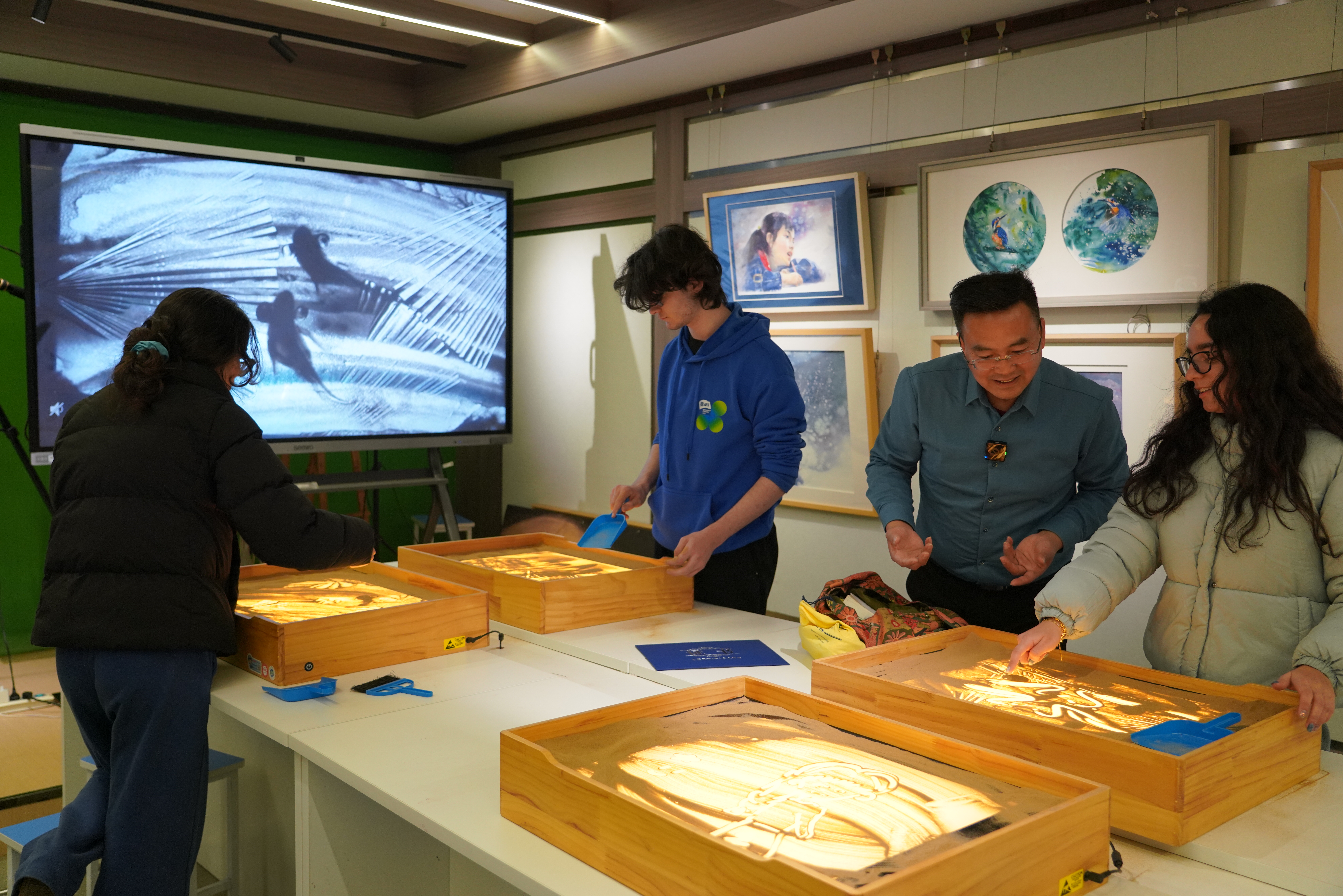 12月16日下午,我校沙畫教室內(nèi)舉行了一場(chǎng)別開(kāi)生面的文化體驗(yàn)活動(dòng)。來(lái)自巴西和新西蘭的國(guó)際交換生,在美術(shù)組梁波老師的專業(yè)指導(dǎo)下,親身學(xué)習(xí)并創(chuàng)作沙畫,在動(dòng)手中感受了這一獨(dú)特藝術(shù)的魅力,也完成了一次生動(dòng)的文化交流。