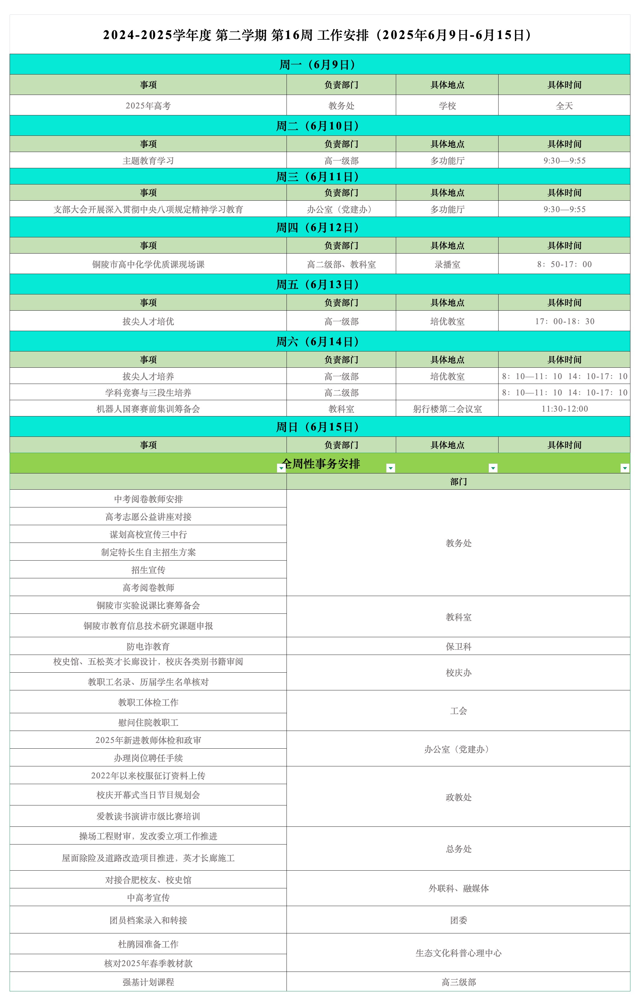 銅陵三中2025年春季學(xué)期周工作安排(2025年6月9日-6月15日)