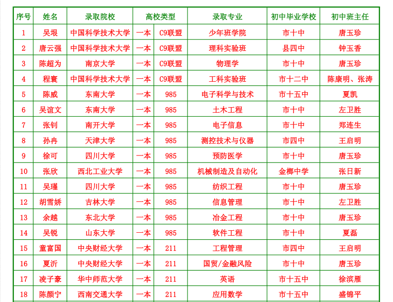 首屆“實(shí)驗(yàn)小班”全體34名同學(xué)高考文化課成績?nèi)窟_(dá)到本科線,創(chuàng)造了本科100%達(dá)線的輝煌成績。高考錄取結(jié)果也令人驚嘆:共有33名同學(xué)被一本院校錄取,創(chuàng)造了一本院校錄取率97.1%的奇跡。其中,有4人進(jìn)入“C9聯(lián)盟”名校(九校聯(lián)盟(C9),中國首個頂尖大學(xué)間的高校聯(lián)盟,2009年10月成立,聯(lián)盟成員包括北京大學(xué)、清華大學(xué)、浙江大學(xué)、復(fù)旦大學(xué)、上海交通大學(xué)、南京大學(xué)、中國科技大學(xué)、哈爾濱工業(yè)大學(xué)和西安交通大學(xué)共9所高校),14人被“985”高校錄取,26人考入“211”重點(diǎn)大學(xué)。