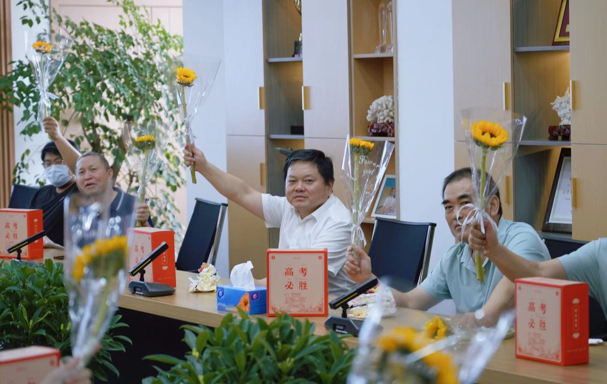 6月4日上午8點30分,校黨委副書記、副校長王合進,黨委副書記張國榮為即將把學子們送入高考考場的高三班主任們切下象征勝利與甜蜜的蛋糕,并向每位班主任送上了寓意陽光和希望的向日葵花束,以及滿滿的祝福。