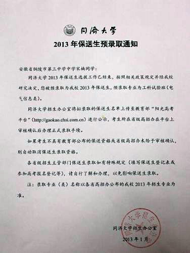 本校訊 近日,從同濟大學(xué)招生辦獲悉,在2013年同濟大學(xué)保送生選拔考試中,我校宋楠同學(xué)表現(xiàn)出色,被985、211全國重點高校同濟大學(xué)提前錄取。在此,學(xué)校向被提前錄取的宋楠同學(xué)表示熱烈地祝賀,向高三年級全體教師表示衷心地感謝。