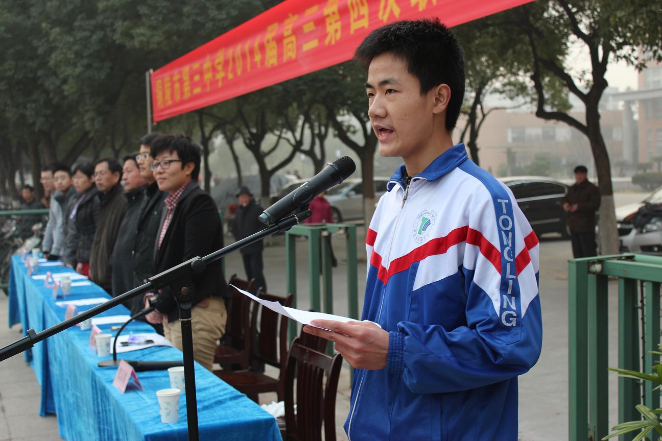 此次大會(huì)特別邀請了正在復(fù)旦大學(xué)就讀的我校2013屆畢業(yè)生宋楠同學(xué)和正在南京大學(xué)就讀的姚遠(yuǎn)同學(xué),他們在發(fā)言中激勵(lì)學(xué)弟學(xué)妹們樹立自己的信心和斗志,制定科學(xué)的復(fù)習(xí)策略,全身心地投入到高考備考中,為夢想不斷努力。高三學(xué)生代表也表示將不辜負(fù)家人和老師的期望,抓緊每一分每一秒,堅(jiān)持拼搏,永不放棄,永不言敗。全體高三學(xué)生舉起右手,緊握拳頭,以銅陵三中的名義莊嚴(yán)宣誓:挑戰(zhàn)2014年高考,再創(chuàng)輝煌……聲響威震銅都大地!