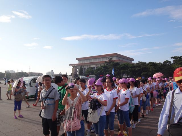 列隊(duì)準(zhǔn)備去毛主席紀(jì)念堂瞻仰,碧空如洗的藍(lán)天讓營(yíng)員不禁舉起攝像機(jī)!