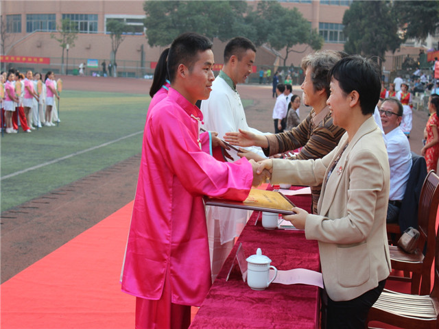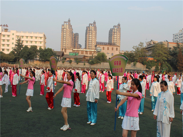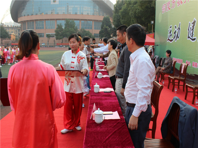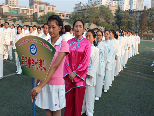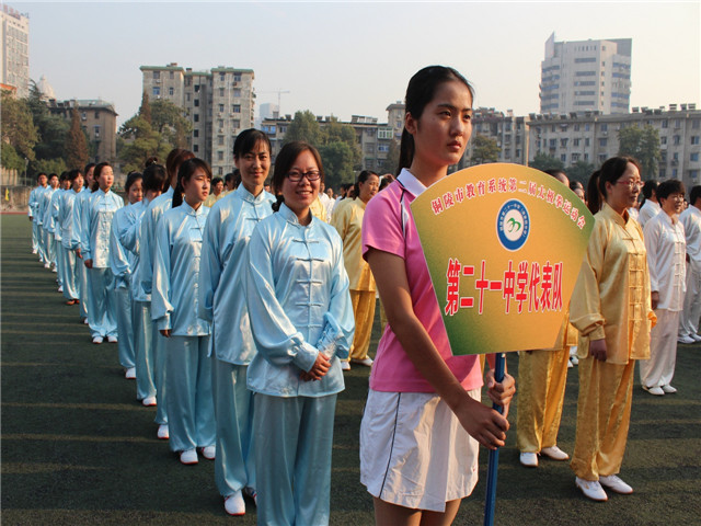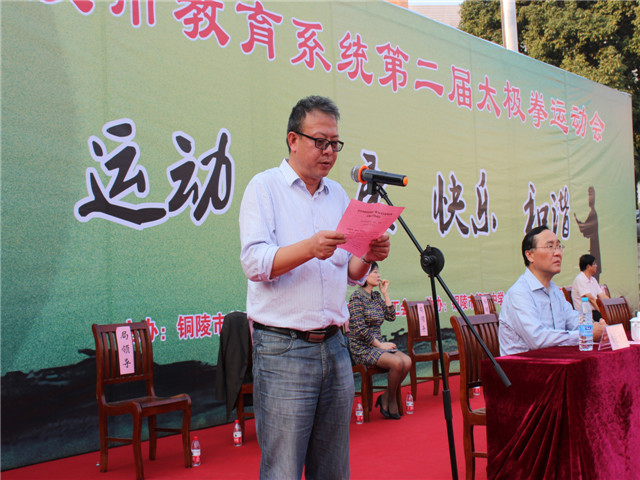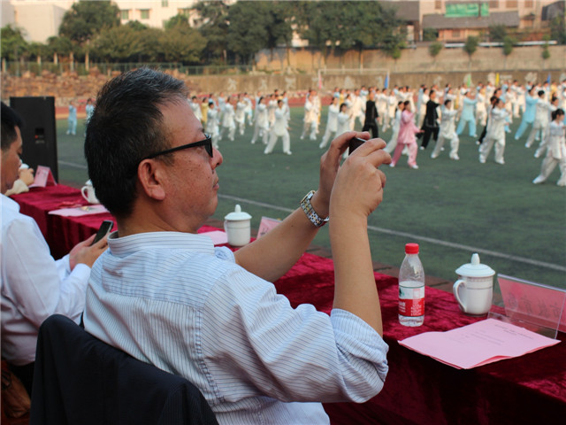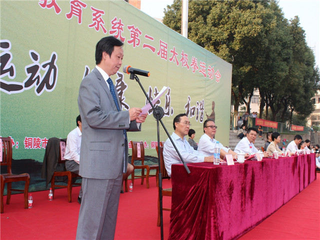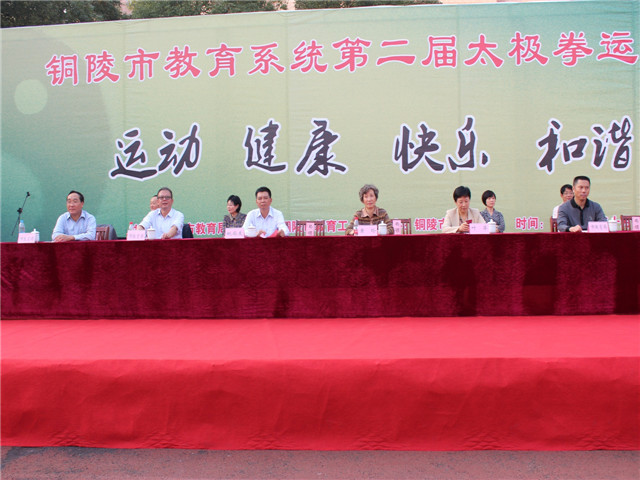 本校訊 2014年10月18日下午,第二屆全市教育系統(tǒng)24式太極拳比賽在銅陵三中操場落下帷幕,市人大副主任黃玲、副市長葉萍、市政協(xié)副主席姚尚友、市教育局局長李勇等參加了閉幕式,此次比賽由市教育局主辦、市教育局工會承辦、市第三中學(xué)協(xié)辦,來自全市的24支代表隊和28名個人參加了此次比賽。