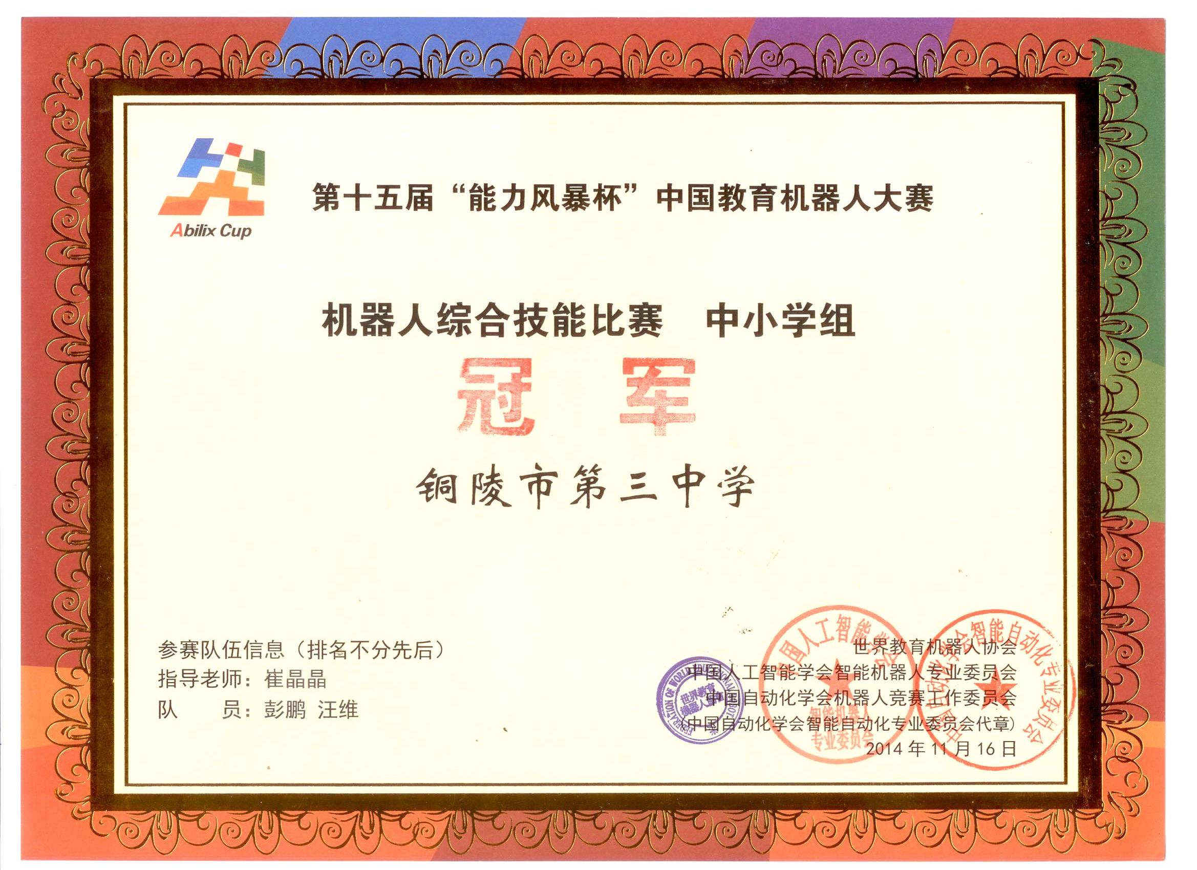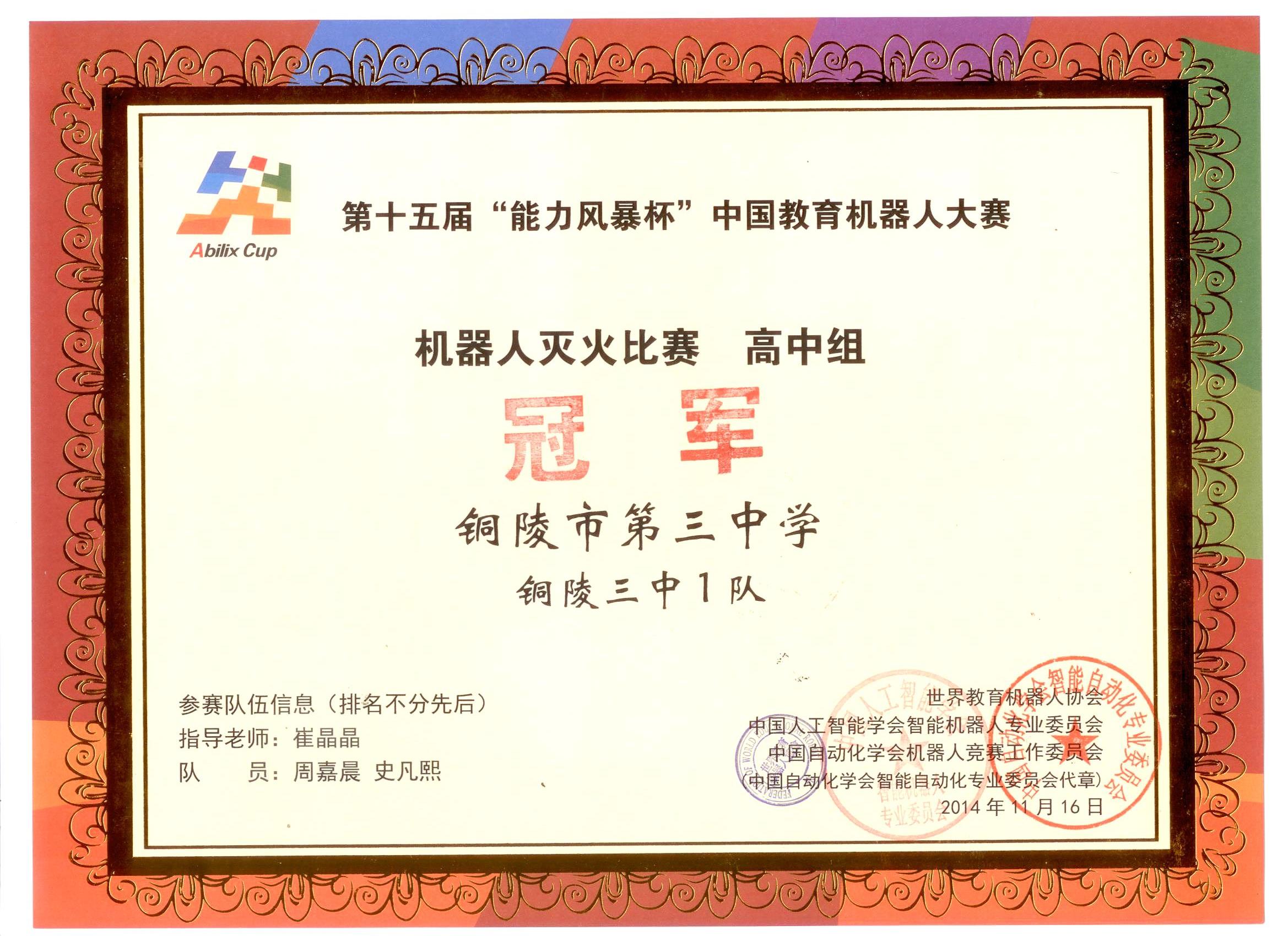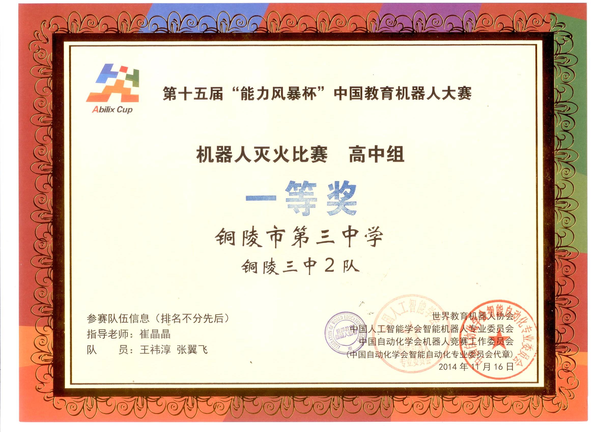我校機(jī)器人活動中心共組織6名同學(xué)參加機(jī)器人滅火和機(jī)器人綜合技能比賽。彭鵬、汪維同學(xué)聯(lián)袂在機(jī)器人綜合技能比賽中以絕對優(yōu)勢奪冠,繼7月在烏魯木齊奪冠以后再續(xù)輝煌;周嘉晨、史凡熙同學(xué)組成銅陵三中1隊(duì)在機(jī)器人滅火比賽中也勇奪冠軍,繼2011年宋楠同學(xué)后再捧全國機(jī)器人滅火比賽冠軍獎杯;王祎淳、張翼飛同學(xué)組成銅陵三中2隊(duì)也有出色表現(xiàn),獲得第四名(全國一等獎)。