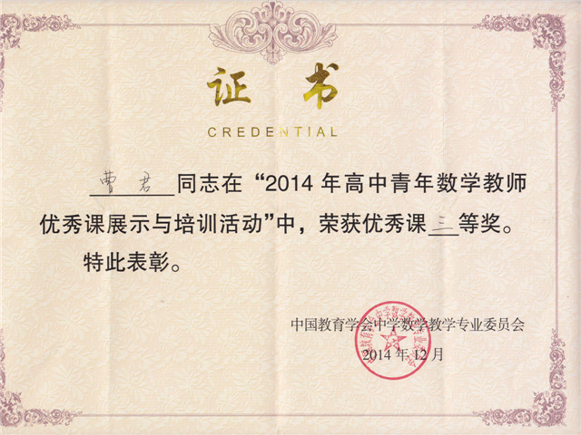 十二月上旬,中國(guó)教育學(xué)會(huì)數(shù)學(xué)教學(xué)專業(yè)委員會(huì)2014年全國(guó)高中數(shù)學(xué)優(yōu)質(zhì)課評(píng)比活動(dòng)在美麗的山城重慶召開。我校數(shù)學(xué)組曹君老師,在市教育局?jǐn)?shù)學(xué)教研員金超老師的悉心指導(dǎo)下,在全體三中數(shù)學(xué)組老師的共同幫助下,從2013年5月開始通過(guò)市優(yōu)質(zhì)課到省錄像課,再到省優(yōu)質(zhì)課的層層遴選,最終榮獲了此次高中數(shù)學(xué)優(yōu)質(zhì)課比賽全國(guó)三等獎(jiǎng),這也是我校數(shù)學(xué)組目前獲獎(jiǎng)獎(jiǎng)級(jí)最高的獎(jiǎng)項(xiàng)。