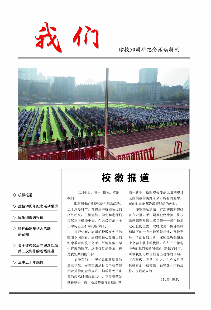 回顧過去一年,思緒萬千,累累碩果飄香:2015年,我校高考成績再創(chuàng)輝煌。緊接著,三中又迎來一批高一新生,為學校注入了新鮮血液。2015年,一場場熱火朝天的活動讓學校更加紅紅火火——第50屆田徑運動會、教職工籃球比賽、學生會和各社團組織豐富多彩的展示活動等等充分展現(xiàn)了全體師生拼搏向上、團結合作的熠熠風采;高三畢業(yè)成人禮、五十周年建校紀念活動、校園文化藝術節(jié)等活動,充分展現(xiàn)了學子風采,展示了學子才藝,陶冶了學生情操,提升了學生精神文化素養(yǎng)。?段覀儭吩俣葥P帆遠航,學生會活動漸入佳境,志愿活動熱火朝天,豐富了校園生活,提升了同學們的綜合素質和能力。全體師生在活動中享受樂趣,收獲幸福。