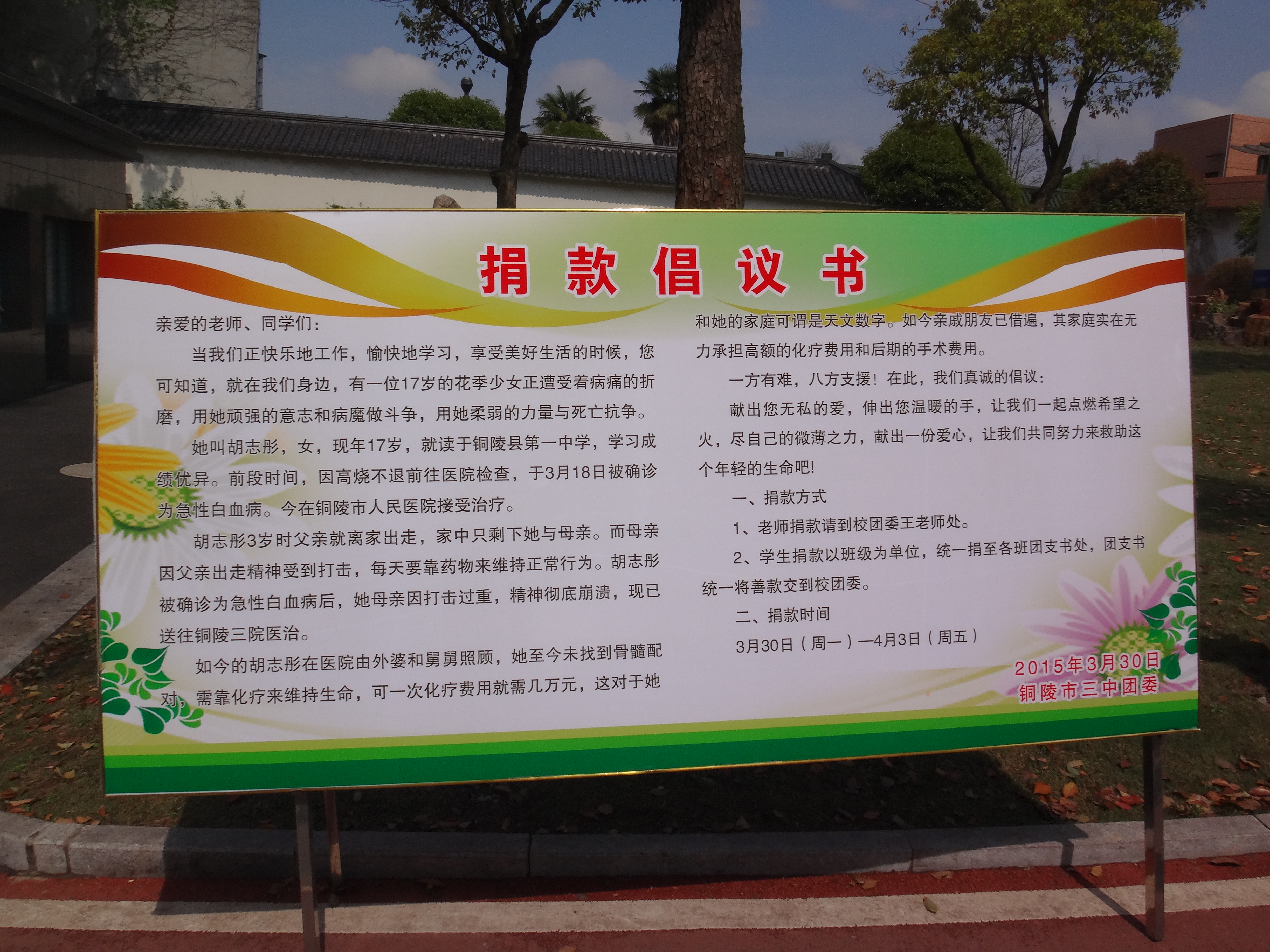 2015年3月30日,校團委從我校219班崔云同學處得知,銅陵縣一中學生胡志彤突患急性白血病,因家境貧寒,實在無力承擔高昂治療費用,急需援助。消息確認后,校團委積極行動,及時召開各班級團干動員會,并先后在學校大門口展板和校園網(wǎng)發(fā)布捐款倡儀書。