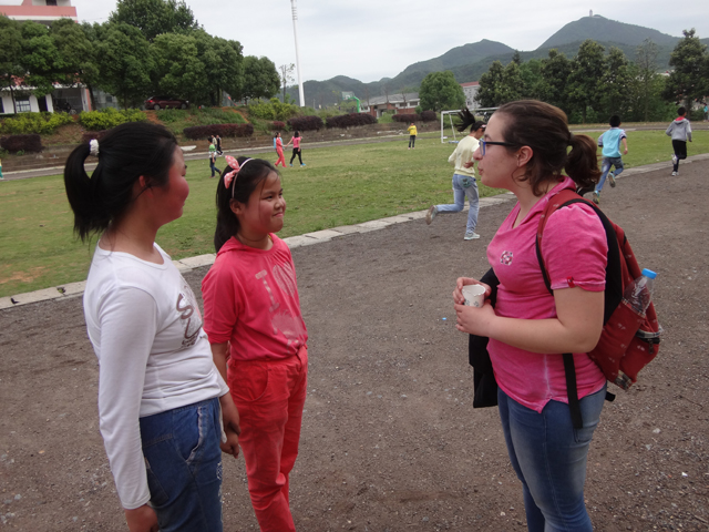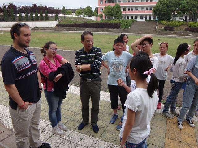 外教的到來,讓鄉(xiāng)村學(xué)校的領(lǐng)導(dǎo)也很感動(dòng)?紤]到分班授課的局限性,最后一節(jié)課索性搬到了學(xué)校的室外運(yùn)動(dòng)場(chǎng)上,孩子們和兩位老外一起玩游戲進(jìn)行互動(dòng),氣氛熱烈,高潮迭起。第一次零距離聆聽外教授課,同學(xué)們都覺得很新鮮,受益匪淺。