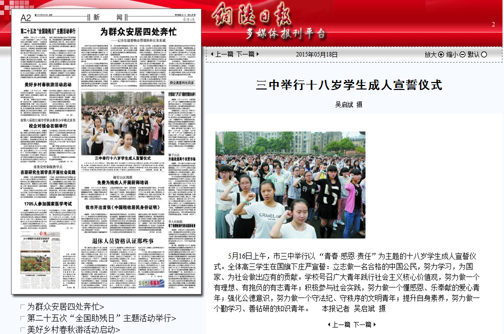 5月16日上午,市三中舉行以 “青春·感恩·責(zé)任”為主題的十八歲學(xué)生成人宣誓儀式。全體高三學(xué)生在國(guó)旗下莊嚴(yán)宣誓:立志做一名合格的中國(guó)公民,努力學(xué)習(xí),為國(guó)家、為社會(huì)做出應(yīng)有的貢獻(xiàn)。學(xué)校號(hào)召?gòu)V大青年踐行社會(huì)主義核心價(jià)值觀,努力做一個(gè)有理想、有抱負(fù)的有志青年;積極參與社會(huì)實(shí)踐,努力做一個(gè)懂感恩、樂(lè)奉獻(xiàn)的愛心青年;強(qiáng)化公德意識(shí),努力做一個(gè)守法紀(jì)、守秩序的文明青年;提升自身素養(yǎng),努力做一個(gè)勤學(xué)習(xí)、善鉆研的知識(shí)青年。 本報(bào)記者 吳啟斌 攝