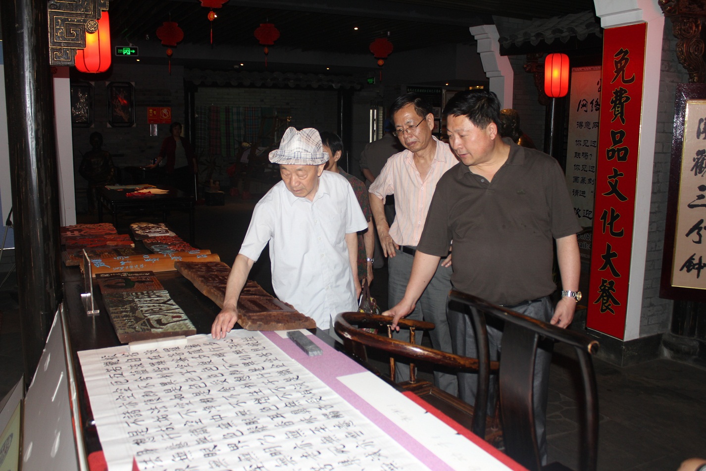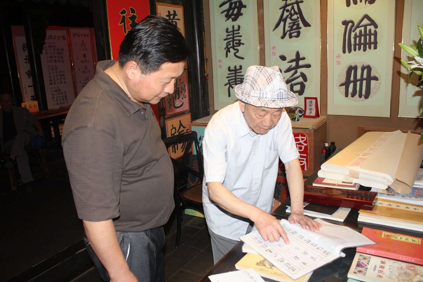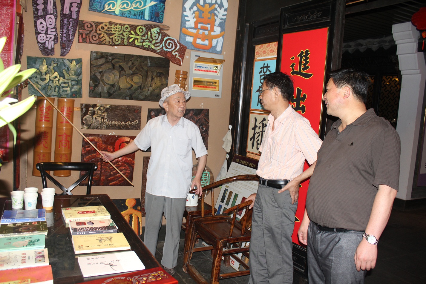 在黃老的工作室,黃老為鐘校和吳書記介紹了他近期的藝術(shù)作品,一幅幅緊扣時(shí)代的精美書法、木雕、竹雕作品蘊(yùn)含深刻哲理,令人無限遐想。黃老十分關(guān)注三中的發(fā)展形勢(shì),他很欣慰地看到三中近些年努力拼搏的成就。