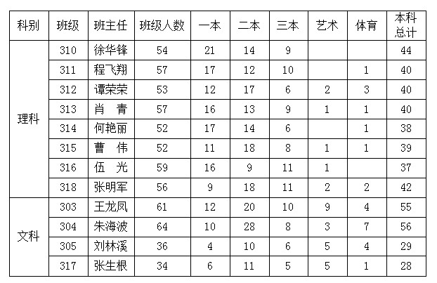 理科實驗班308班(班主任:胡春林)本科達線率96.5%(班級人數(shù)57人,本科達線55人),其中一本達線率71.9%(一本達線41人),600分以上18人。