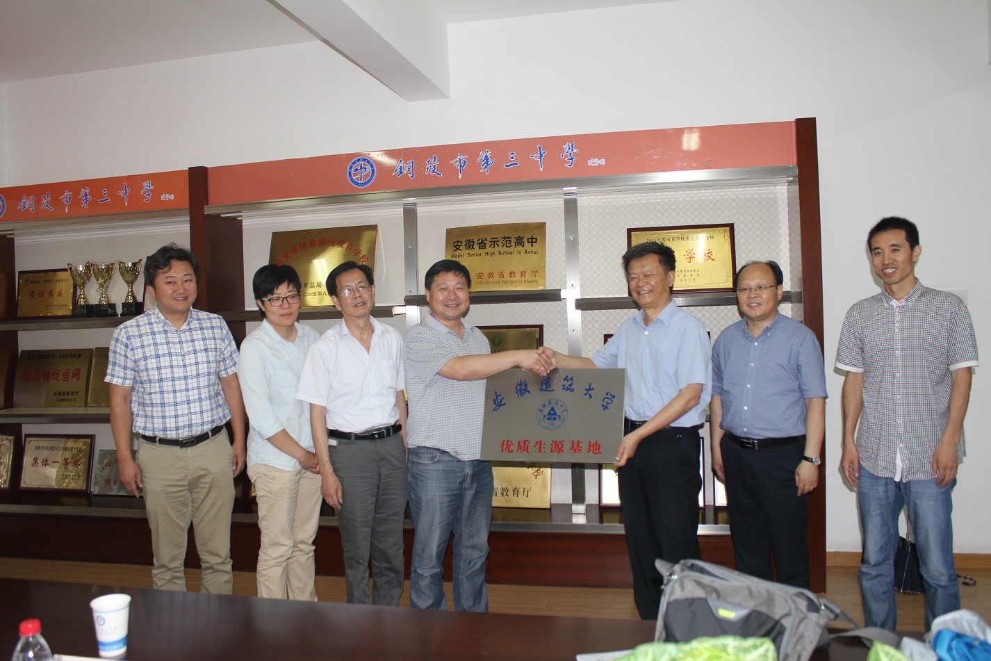 近日,安徽建筑大學黨委書記楊兵、建筑與規(guī)劃學院院長儲金龍、建筑與規(guī)劃學院黨委副書記斯方龍一行訪問我校,并向我校授牌“安徽建筑大學優(yōu)質(zhì)生源基地”。我校校長鐘士標、市教育局副局長管清華、三中副書記吳翀、副校長葉葉等出席了活動,雙方簽署了協(xié)議,并合影留念。