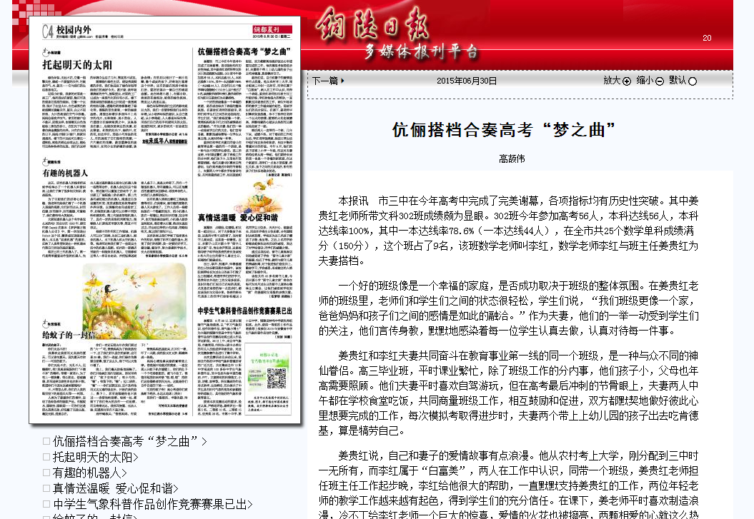 本報(bào)訊 市三中在今年高考中完成了完美謝幕,各項(xiàng)指標(biāo)均有歷史性突破。其中姜貴紅老師所帶文科302班成績頗為顯眼。302班今年參加高考56人,本科達(dá)線56人,本科達(dá)線率100%,其中一本達(dá)線率78.6%(一本達(dá)線44人),在全市共25個(gè)數(shù)學(xué)單科成績滿分(150分),這個(gè)班占了9名,該班數(shù)學(xué)老師叫李紅,數(shù)學(xué)老師李紅與班主任姜貴紅為夫妻搭檔。