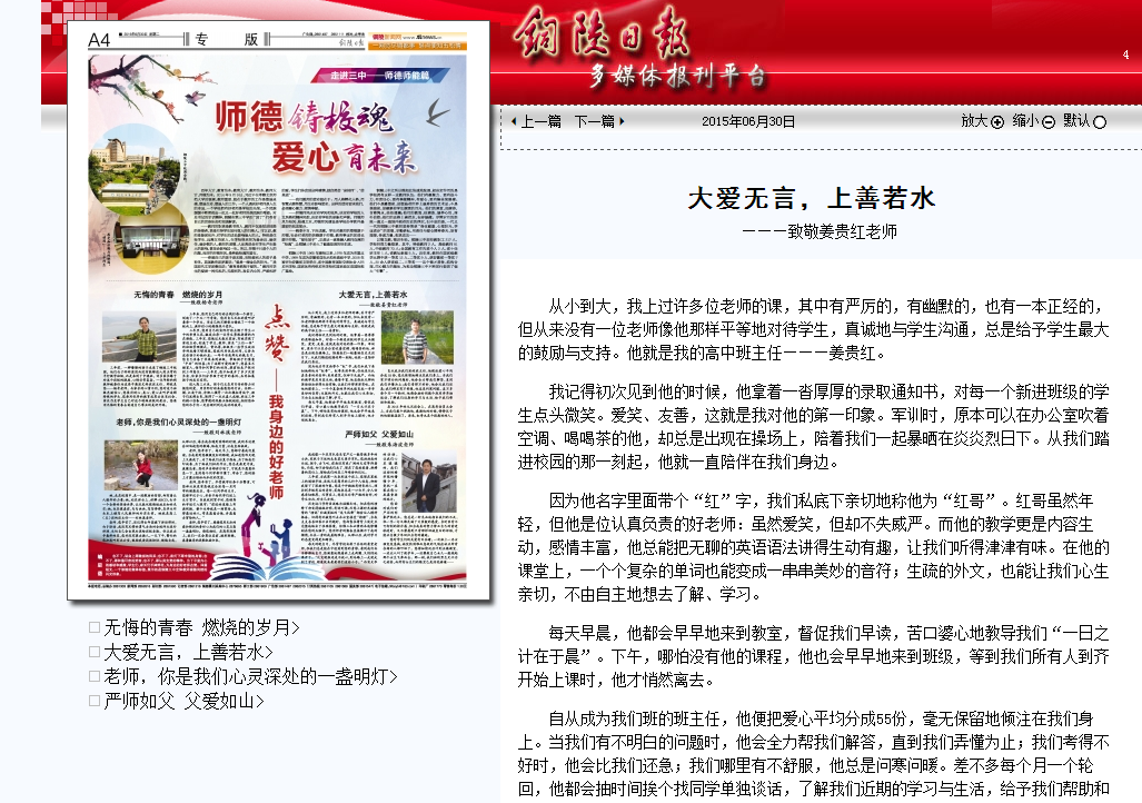 姜貴紅說,自己和妻子的愛情故事有點(diǎn)浪漫。他從農(nóng)村考上大學(xué),剛分配到三中時(shí)一無所有,而李紅屬于“白富美”,兩人在工作中認(rèn)識,同帶一個(gè)班級,姜貴紅老師擔(dān)任班主任工作起步晚,李紅給他很大的幫助,一直默默支持姜貴紅的工作,兩位年輕老師的教學(xué)工作越來越有起色,得到學(xué)生們的充分信任。在課下,姜老師平時(shí)喜歡制造浪漫,冷不丁給李紅老師一個(gè)巨大的驚喜,愛情的火花也被擦亮,兩顆相愛的心就這么熱烈而又踏實(shí)地走到了一起。