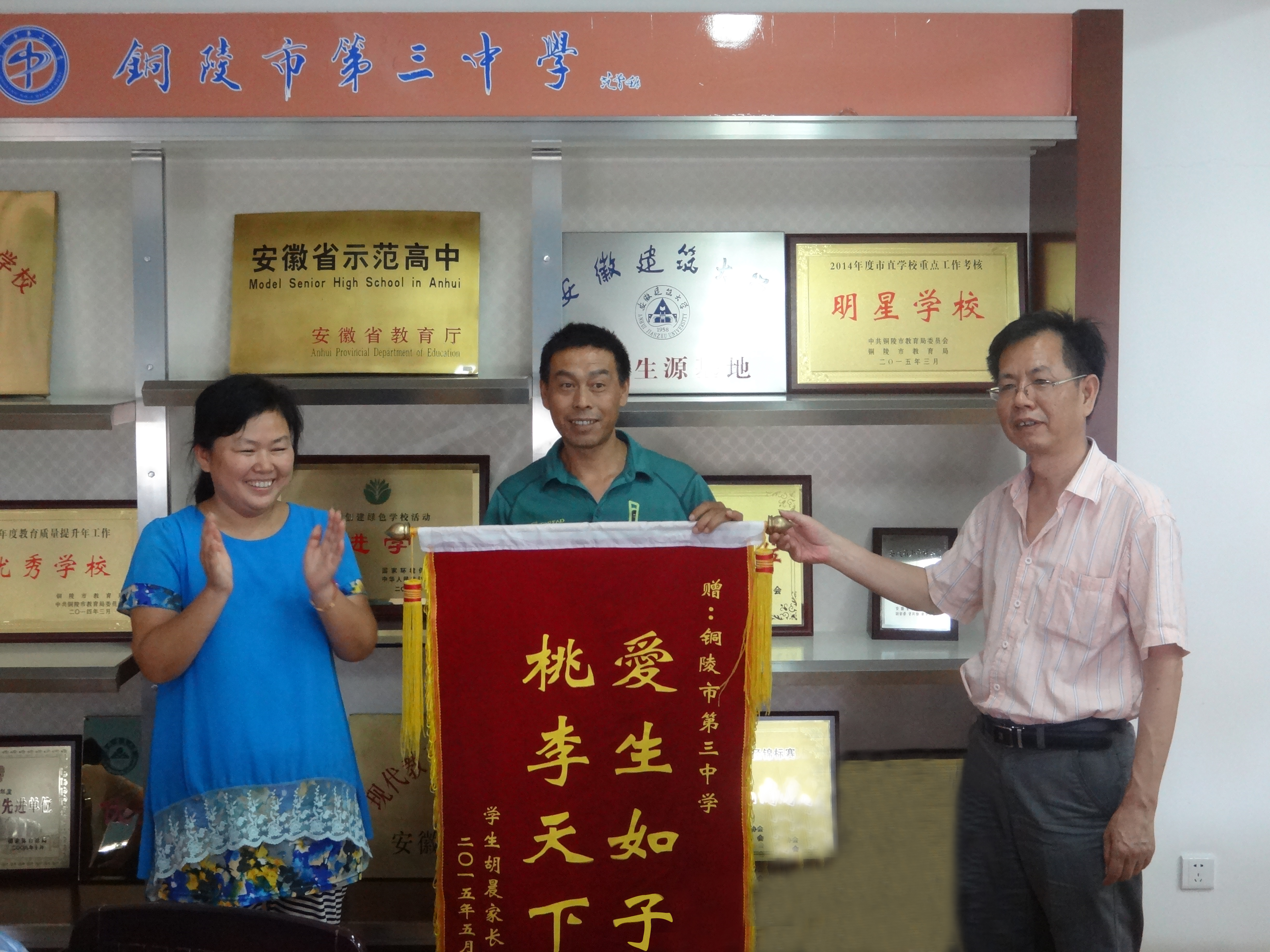錦旗雖輕,情意很重。這是對(duì)銅陵市三中工作的肯定與鼓勵(lì)。“身體健康,心理陽光,學(xué)業(yè)進(jìn)步”是我校的辦學(xué)目標(biāo),我們堅(jiān)信每一位學(xué)生都是學(xué)校的驕傲、祖國的未來,讓三中3000多名學(xué)生都能充分的發(fā)展和提升正是我們的責(zé)任和義務(wù)。今后我們將繼續(xù)努力,不辜負(fù)家長和社會(huì)的期待!