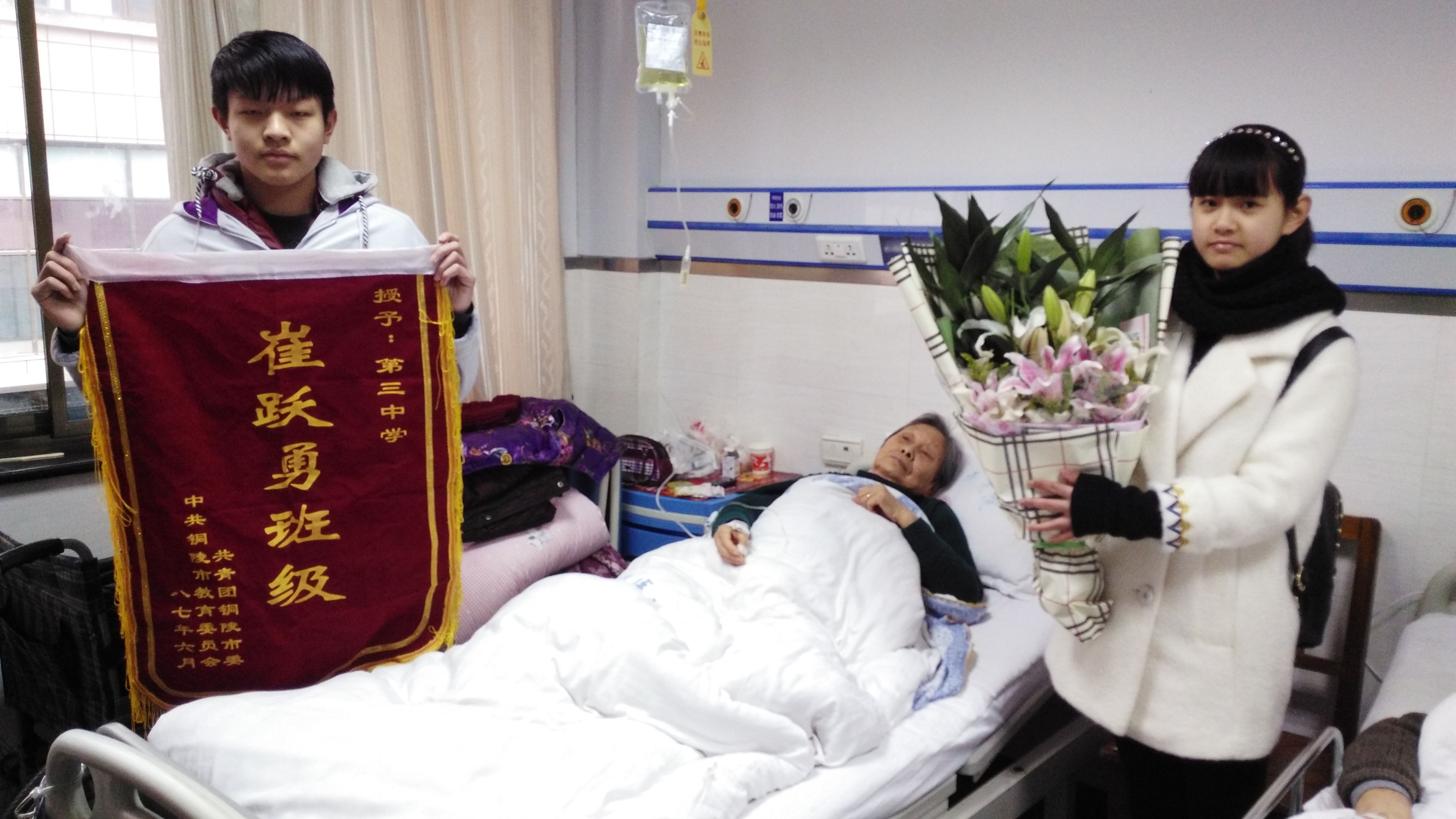 離開醫(yī)院之前,同學們齊聲祝愿崔爺爺、崔奶奶身體早日康復(fù),提前預(yù)祝二老春節(jié)快樂!同學們表示對烈士的敬仰永不磨滅,一定將銅陵三中“崔躍勇班級”的旗幟永遠傳承下去!