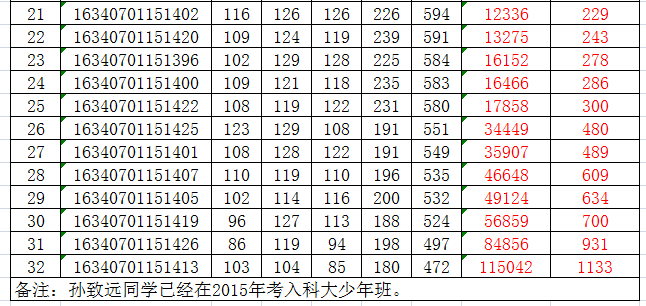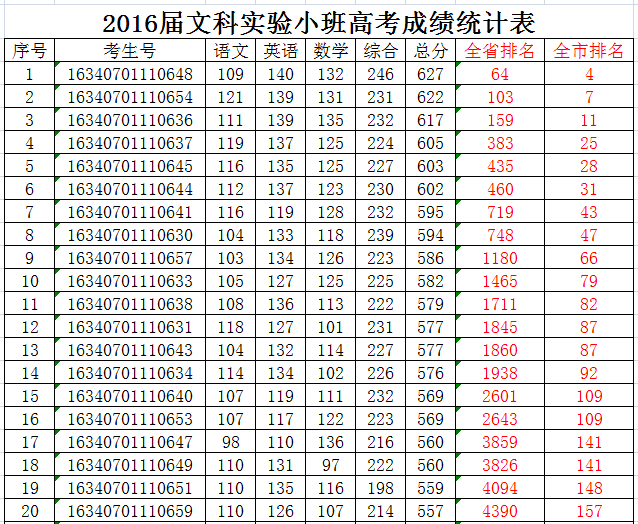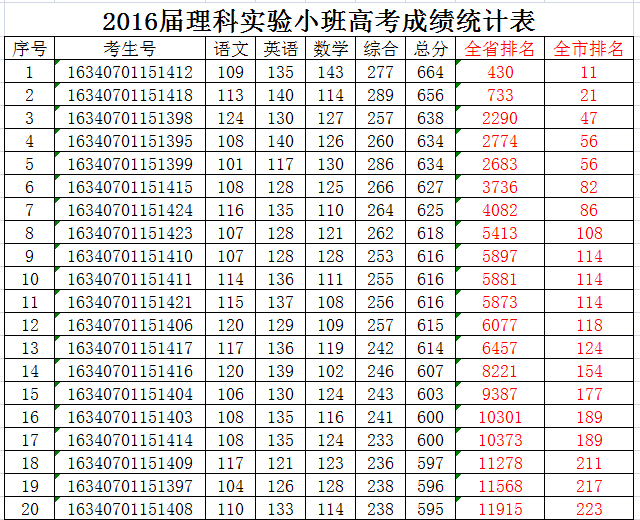 在2016年高考中,三中理科實(shí)驗(yàn)小班(班主任:楊春生)33人全部達(dá)本科線(其中孫致遠(yuǎn)同學(xué)于2015年高二考入科大少年班),31人達(dá)一本線?上驳氖,班上高分頻出,600分以上17人,占全班半數(shù)以上,最高分664分,全市第11名。