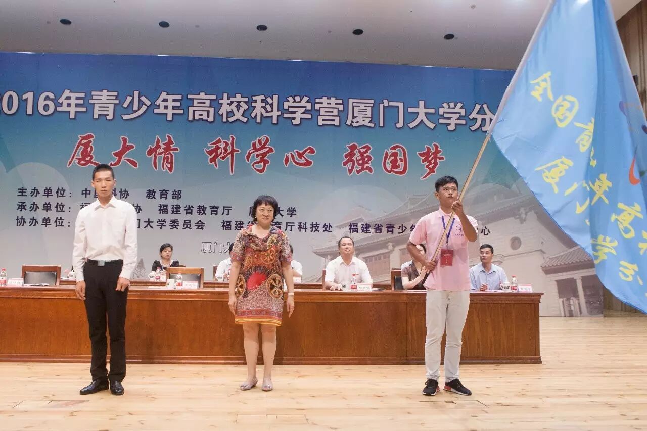 來自廈門集美中學的劉誠作為營員代表發(fā)言。接著,與會領(lǐng)導共同啟動了2016年青少年高?茖W營廈門大學分營,省教育廳科技處陳碧珍副處長向營員代表授廈門大學分營營旗。