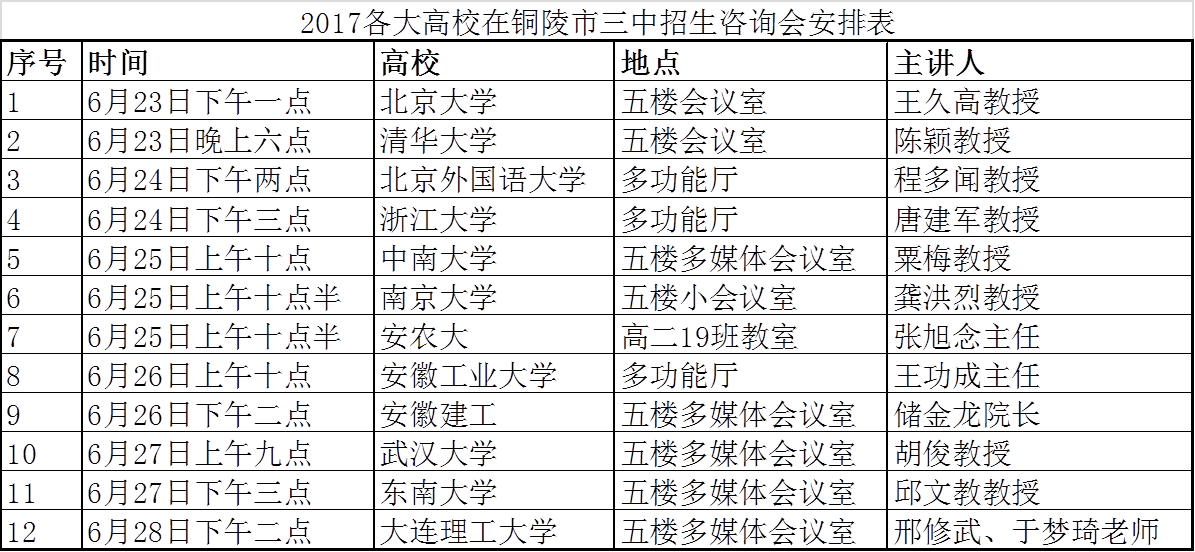 自6月23日高考高考發(fā)榜以來,北京大學(xué)、清華大學(xué)、浙江大學(xué)、北京外國語大學(xué)等一大批知名高校紛紛與我校聯(lián)系開展專場宣講活動。我校教務(wù)處、外聯(lián)科和高三年級部協(xié)調(diào)配合,積極聯(lián)系考生并為來校宣講的高校提供場地和相關(guān)設(shè)備,讓考生了解更多的高校信息,也讓更多高校了解我?忌,為我校2017屆畢業(yè)生做好在銅陵三中的日子中最后一項,也是最重要的一項服務(wù)工作。