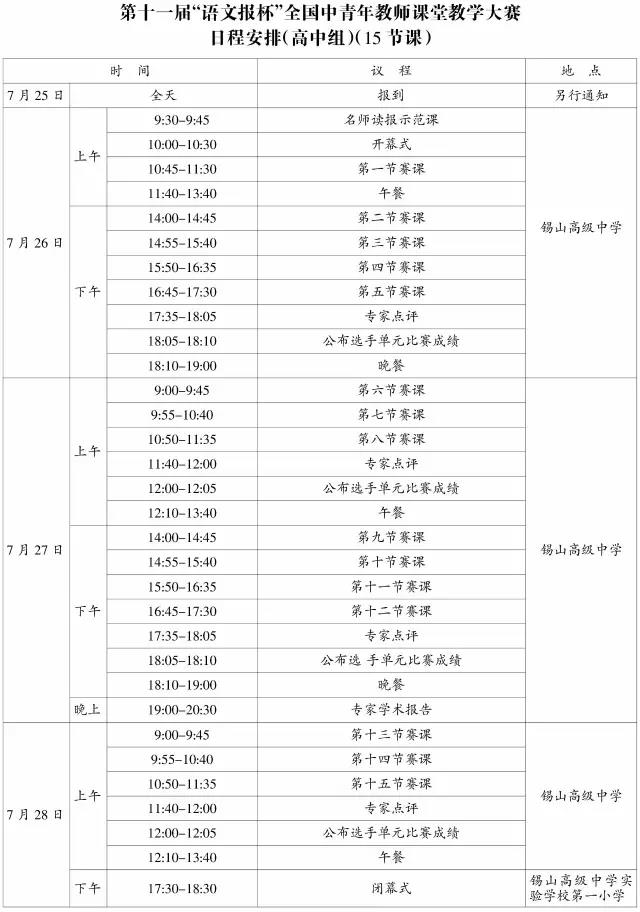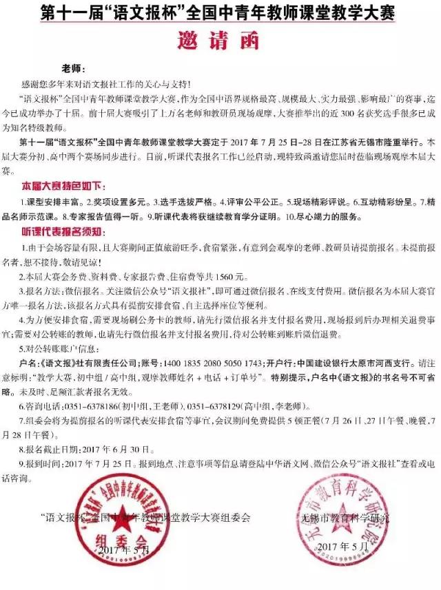 第十一屆“語文報(bào)杯”全國中青年教師課堂教學(xué)大賽定于2017年7月25日在江蘇省無錫市隆重舉行。本屆大賽分初、高中兩個(gè)賽場同步進(jìn)行。大賽繼續(xù)以“弘揚(yáng)課改精神,倡導(dǎo)新型理念,獎(jiǎng)掖優(yōu)秀教師,推廣成功經(jīng)驗(yàn)”為宗旨,其目標(biāo)是“促進(jìn)語文教改,提升教學(xué)技能,傳承中華文化”。目前,聽課代表報(bào)名工作已經(jīng)啟動(dòng),竭誠歡迎全國各地初、高中語文教師和教研員現(xiàn)場觀摩。