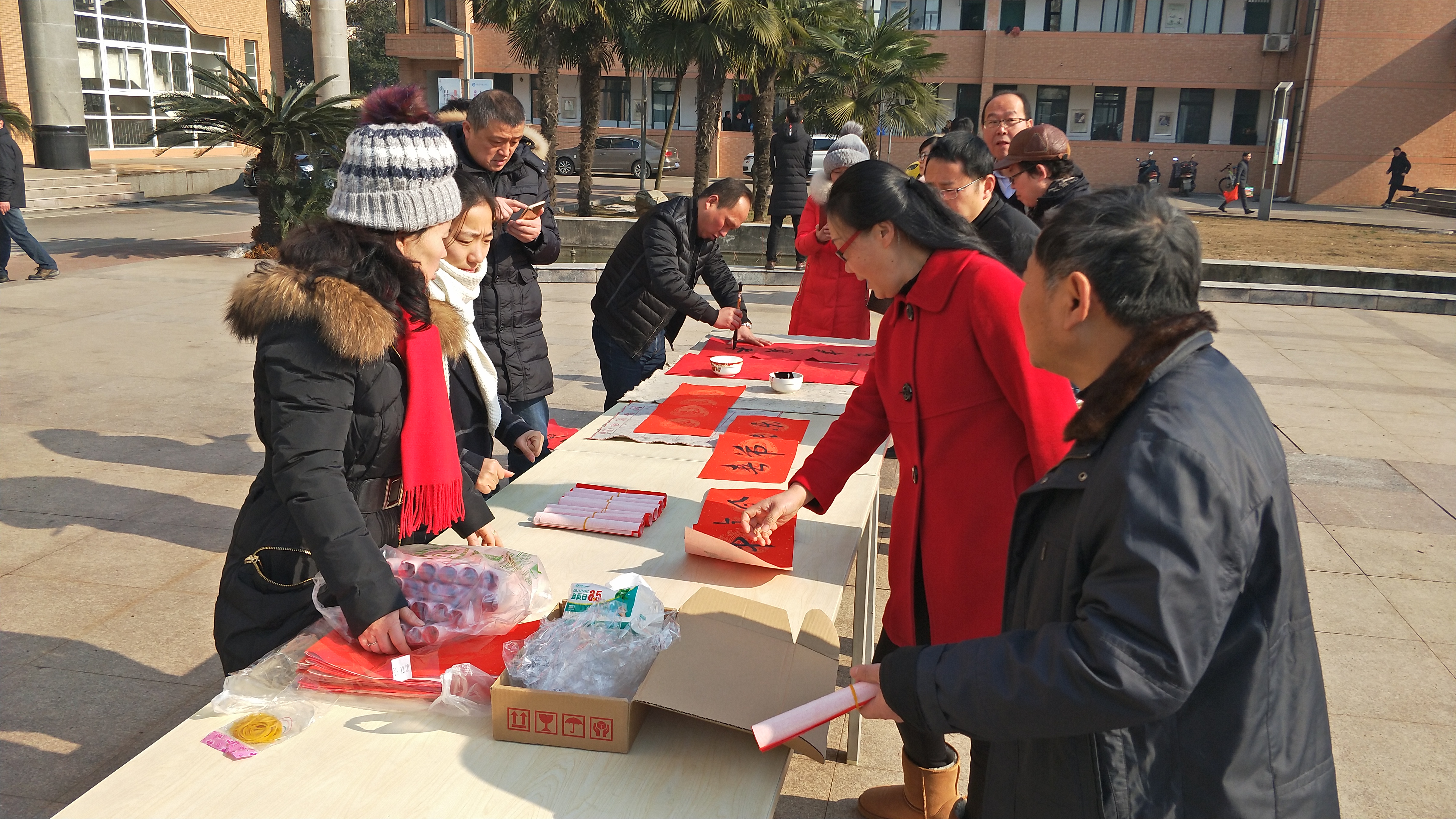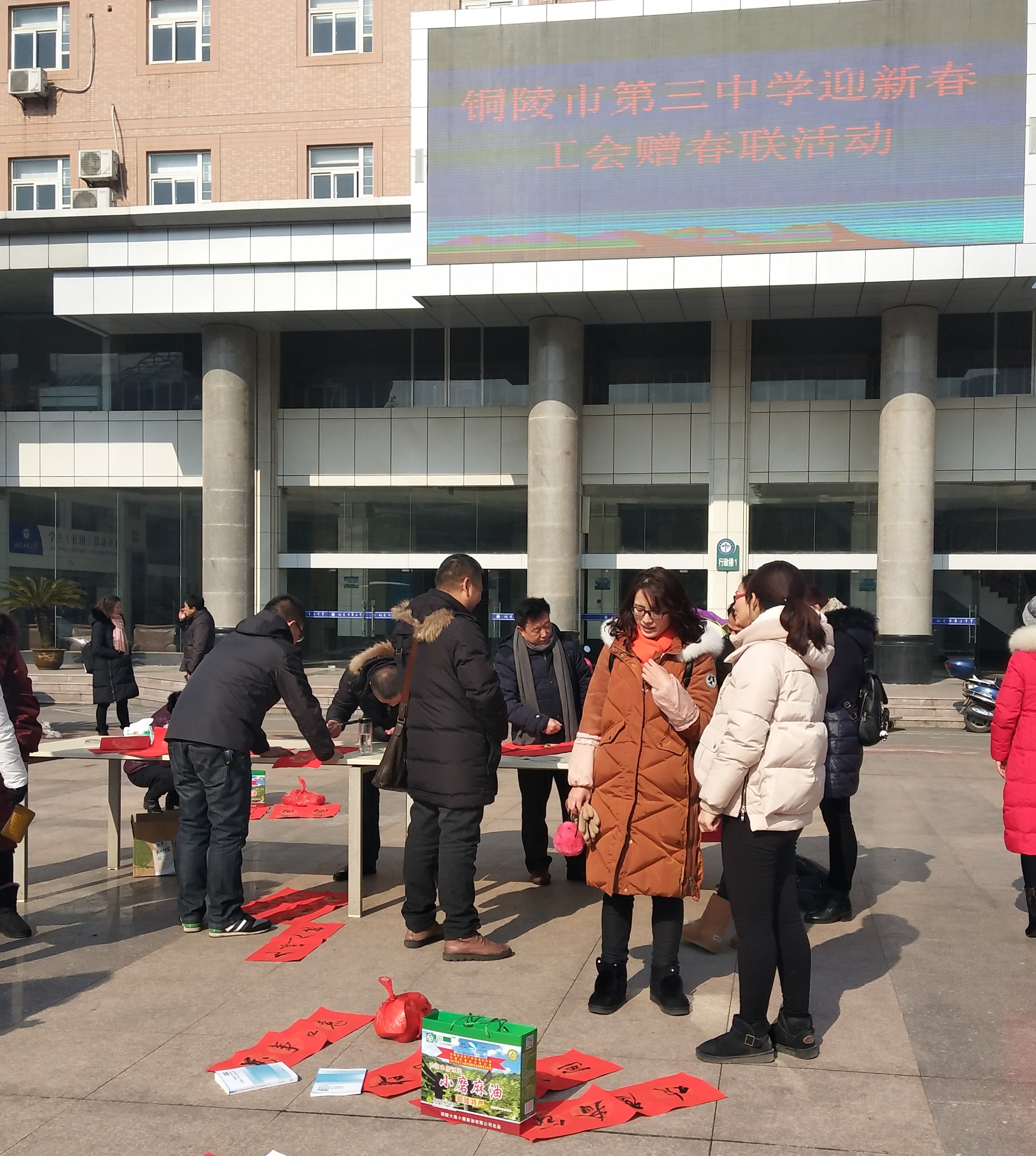 2月6日上午10:00至11:00,銅陵市第三中學(xué)工會(huì)春節(jié)送溫暖系列活動(dòng)之“弘揚(yáng)好家風(fēng)•迎春送百!袝覔]毫送春聯(lián)活動(dòng)”在校綜合樓前廣場(chǎng)舉辦。