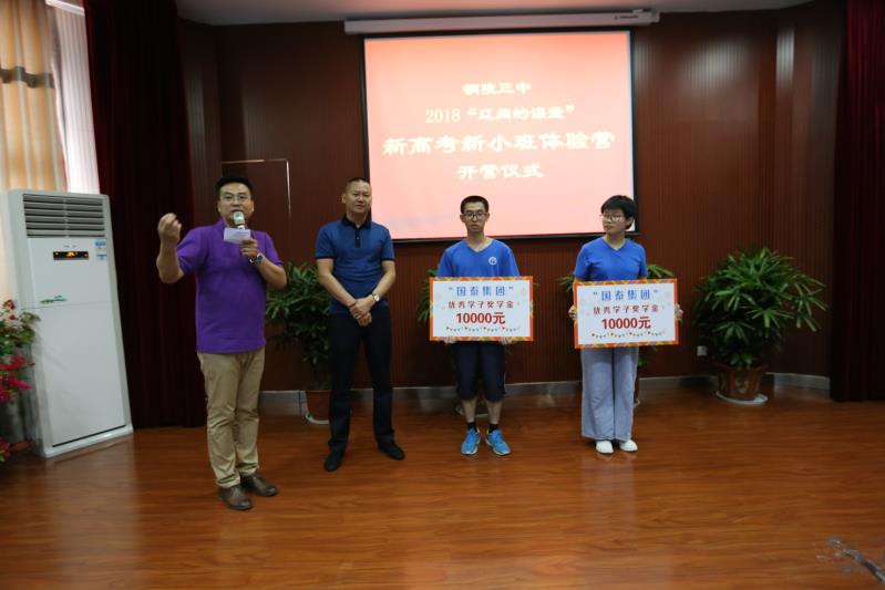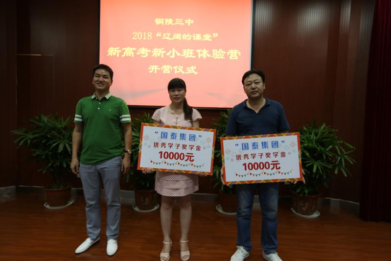 近年來三中的發(fā)展,全市人民有目共睹,我們?nèi)〉玫拿恳粋(gè)成就都受到社會(huì)各界的熱切關(guān)注。安徽國(guó)泰建筑集團(tuán)特意來到三中參加此次開營(yíng)儀式,為我們?nèi)〉脙?yōu)異成績(jī)的學(xué)子,送來他們的一份心意。集團(tuán)董事長(zhǎng)張自州,總經(jīng)理張四兵為優(yōu)秀學(xué)子代表夏羿,李旻分別送上一萬元獎(jiǎng)學(xué)金,并決定為三中學(xué)子成立長(zhǎng)期的獎(jiǎng)學(xué)金基金。