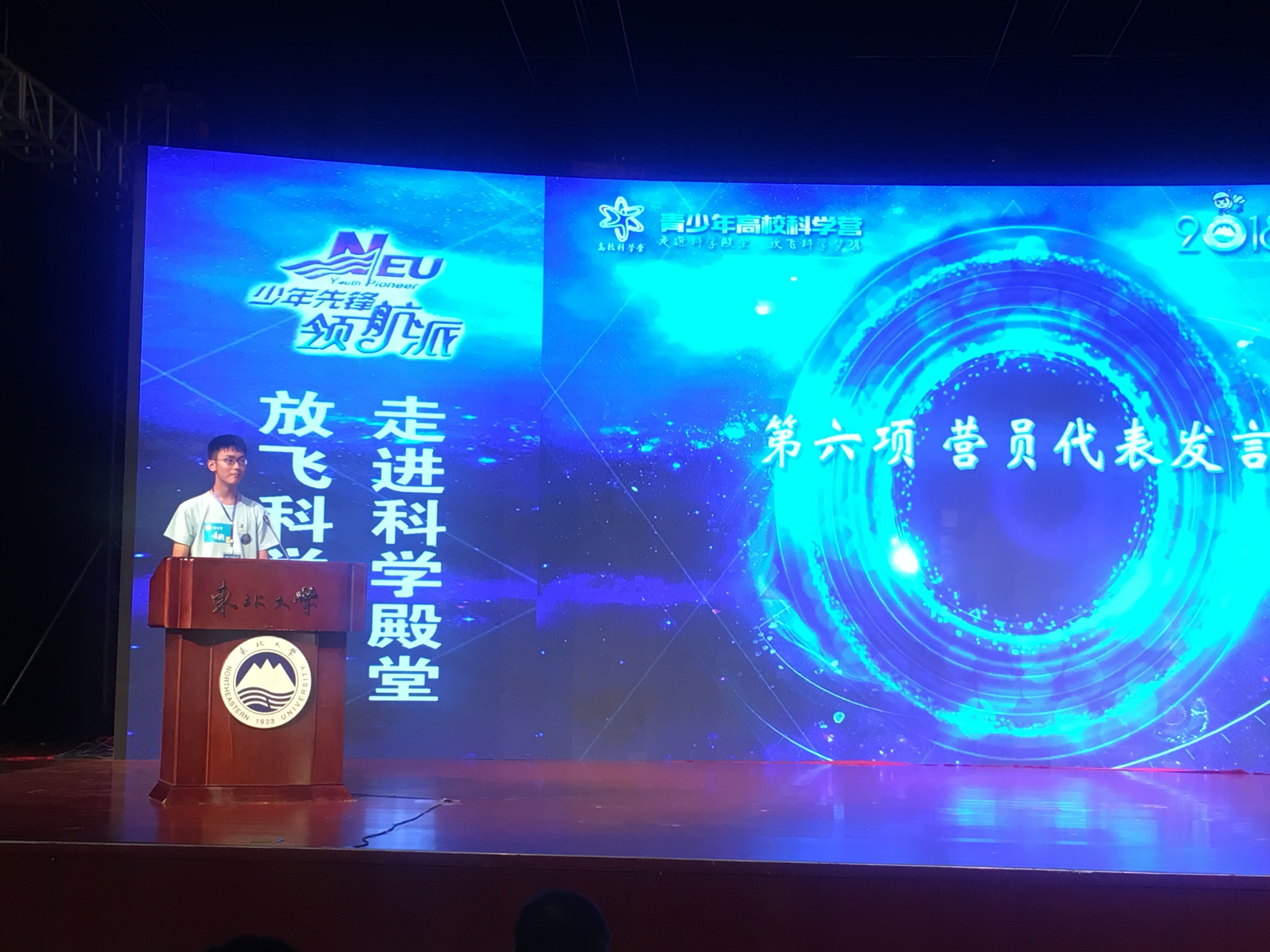 今年是東北大學承辦科學營的第七個年頭,同時也恰逢建校95周年,為了以更好更新的風貌迎接科學營和營員師生,為校慶獻禮,本屆科學營對主題與活動進行了全新設計與呈現(xiàn),主題確定為"NEU YOUTH PIONEER"少年先鋒領航派。在開營儀式上由神秘嘉賓“鋼鐵俠”登場介紹整體活動方案,“鋼鐵俠”對日程安排、前期籌備及活動意義等方面詳細介紹了本次活動,讓在場的同學們都大開眼界。我校凌天驄同學作為200名營員的唯一代表在開營儀式上做了發(fā)言,他號召同學們珍惜寶貴的學習機會,用心去參與和感受,多思、多想、多問,認真完成各項學習、實踐任務,不虛此行,滿載而歸。