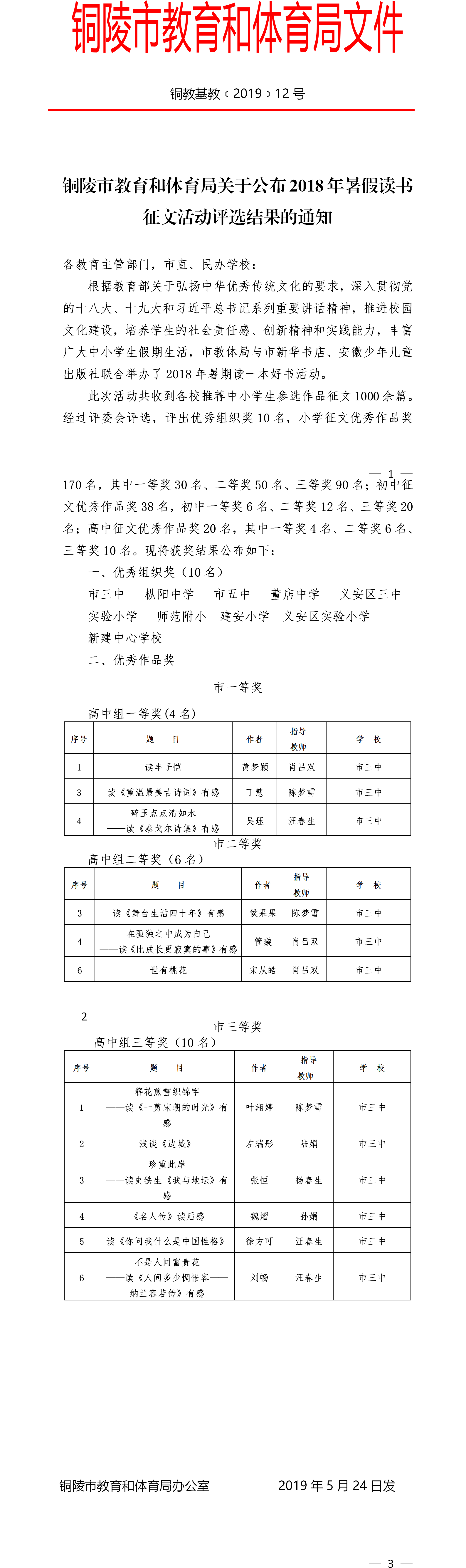 此次活動是根據(jù)教育部關(guān)于弘揚中華優(yōu)秀傳統(tǒng)文化的要求,深入貫徹黨的十八大、十九大和習近平總書記系列重要講話精神,推進校園文化建設(shè),培養(yǎng)學生的社會責任感、創(chuàng)新精神和實踐能力,豐富廣大中小學生假期生活,市教體局與市新華書店、安徽少年兒童出版社聯(lián)合舉辦的2018年暑期讀一本好書活動。此次活動共收到各校推薦中小學生參選作品征文1000余篇。經(jīng)過評委會評選,高中征文優(yōu)秀作品獎20名,其中一等獎4名、二等獎6名、三等獎10名。