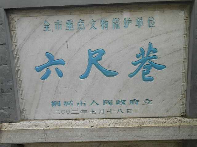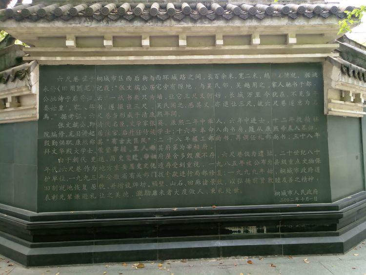 六尺巷的故事在當(dāng)?shù)貜V為流傳。史料記載,清康熙年間,大學(xué)士張英在桐城的老家與吳家為鄰,兩家院落之間有條共用的巷子,吳家在建新房時想占這條路。于是張家人寫信到京城向張英求援,張英回信道:千里來書只為墻,讓他三尺又何妨?萬里長城今猶在,不見當(dāng)年秦始皇。”家人收到信后,豁然開朗,禮讓出三尺空地。吳家深受感動,也主動讓出三尺房基地,“六尺巷”因此得名,成為一段佳話。