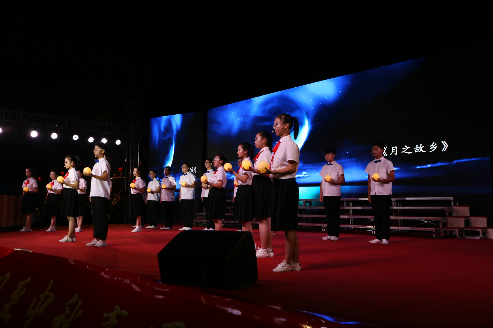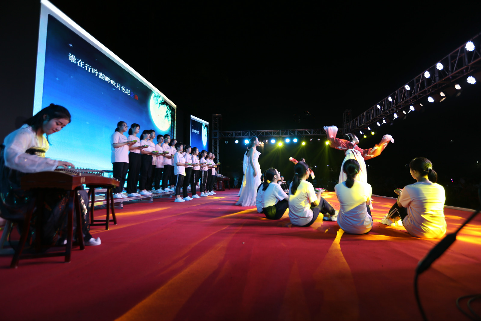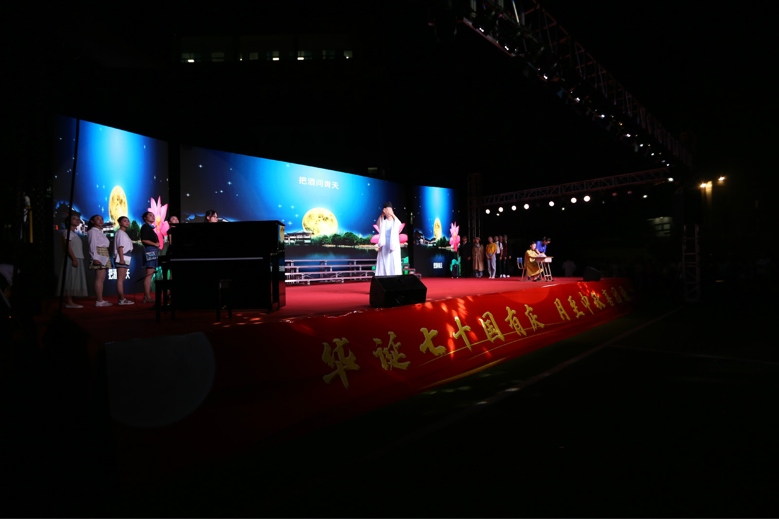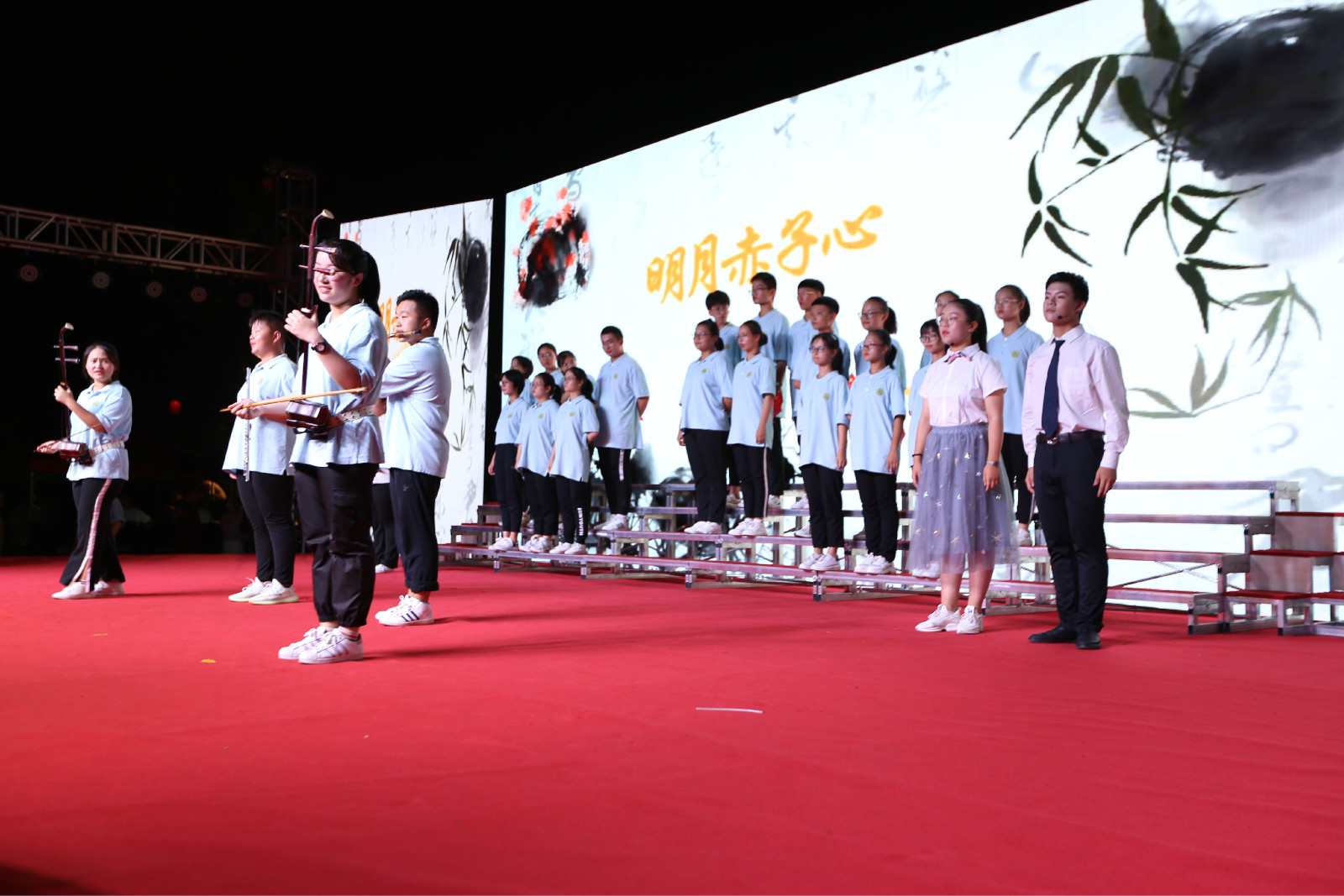 穿越百年,身著漢服溫婉如水的女子,一曲一調恰到好處,共同為大家呈現(xiàn)了一個個花好月圓、詩情畫意的美景中秋,詩會共分寄情明月、追月少年、祝福祖國三個篇章,本次詩會既傳統(tǒng)古典又結合不少現(xiàn)代元素,以“中秋”“詠月”“家國”為主要素材,以團圓、親情、溫暖為感情基調,每一個節(jié)目,都融入人們對團圓的渴望、對家的熱愛,讓節(jié)日的詩意與家的溫馨同啟,讓所有的美好在婉轉吟詠中紛至沓來,《金秋皓月》、《飛揚青春圓夢中國》、《月夜思故卿》等節(jié)目精彩紛呈,令人目不暇接,更讓現(xiàn)場同學感受到了濃濃的中秋氛圍。三個篇章既相互連貫,又相對獨立成篇,節(jié)目的最后,藝術組和語文組演繹的《我和我的祖國》,不僅讓在場觀眾感受到藝術之美,更體會到中國偉大時代的強音!