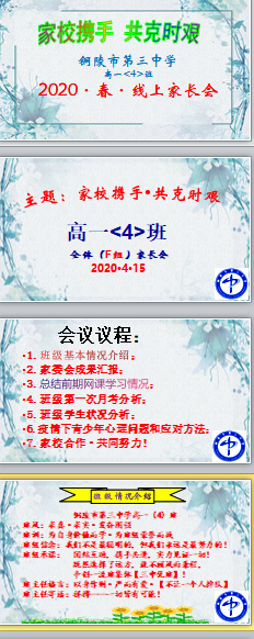 疫情期間,學(xué)校各年級班主任始終通過電話、微信、釘釘、QQ、騰訊課堂等方式,保持與家長、學(xué)生溝通,他們將班會、家長會搬到線上,及時了解學(xué)生居家學(xué)習(xí)、生活狀態(tài)。一直是學(xué)校和家長、學(xué)生聯(lián)系的紐帶,是落實學(xué)校德育工作領(lǐng)導(dǎo)小組實施方案的踐行者,是默默奉獻在學(xué)!皯(zhàn)疫”前線的無名英雄,現(xiàn)學(xué)生返校在即,如何讓家長配合學(xué)校做好學(xué)生的復(fù)課準(zhǔn)備工作?形成家校合力,共克時艱,共迎開學(xué)。三中班主任們在家長視頻會上再一次留下亮麗的掠影。