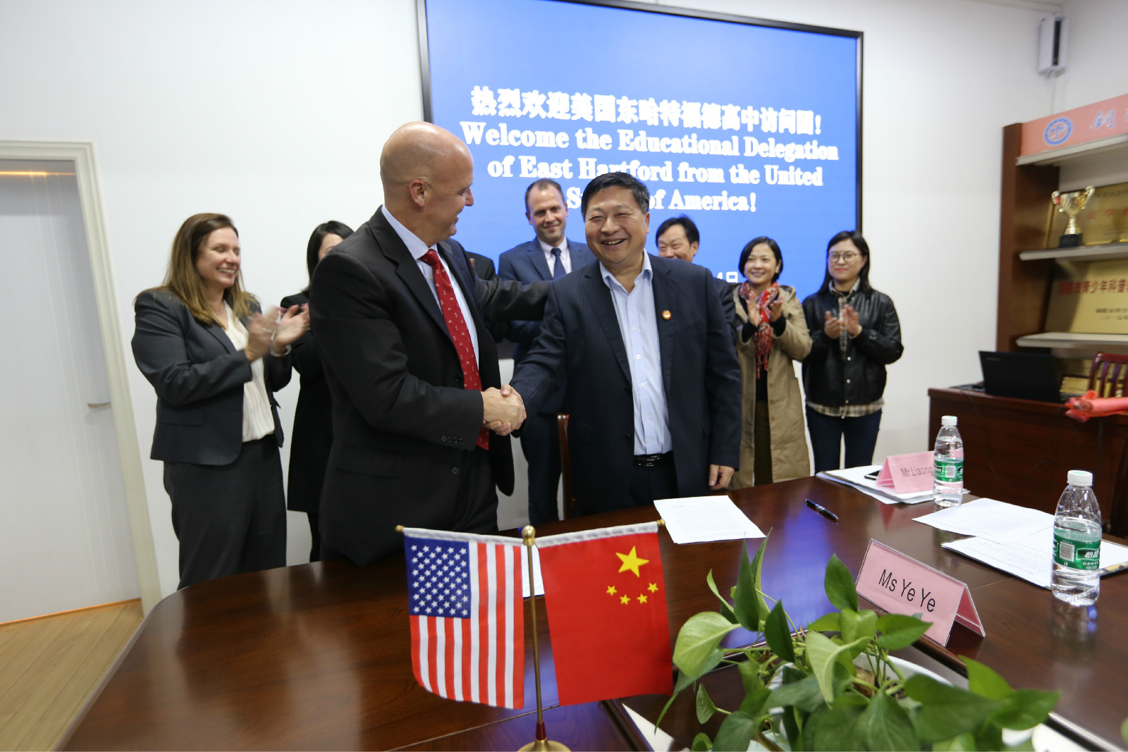 本校訊 11月14日,美國(guó)東哈特福德高中訪問(wèn)團(tuán)教育局長(zhǎng)內(nèi)森.奎斯內(nèi)爾 、人力資源部負(fù)責(zé)人克里斯.衛(wèi)吉、東哈特福德高中校長(zhǎng)馬修.雷恩、語(yǔ)言部負(fù)責(zé)人伊麗莎白.派克祖、東哈特福德高中中文老師陳彥來(lái)我校參觀訪問(wèn),市教體局黨委委員、工會(huì)主席鄭國(guó)和校黨委書(shū)記、校長(zhǎng)鐘士標(biāo)在行政樓五樓會(huì)議室親切接見(jiàn)了美國(guó)訪問(wèn)團(tuán)的客人。