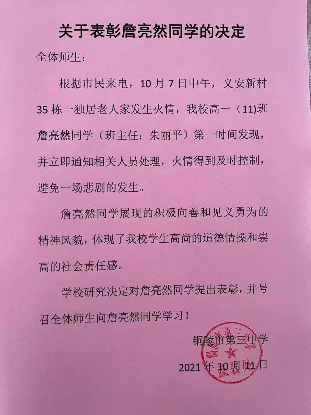 學(xué)校研究決定對詹亮然同學(xué)提出表彰,并號召全體師生向詹亮然同學(xué)學(xué)習(xí)!