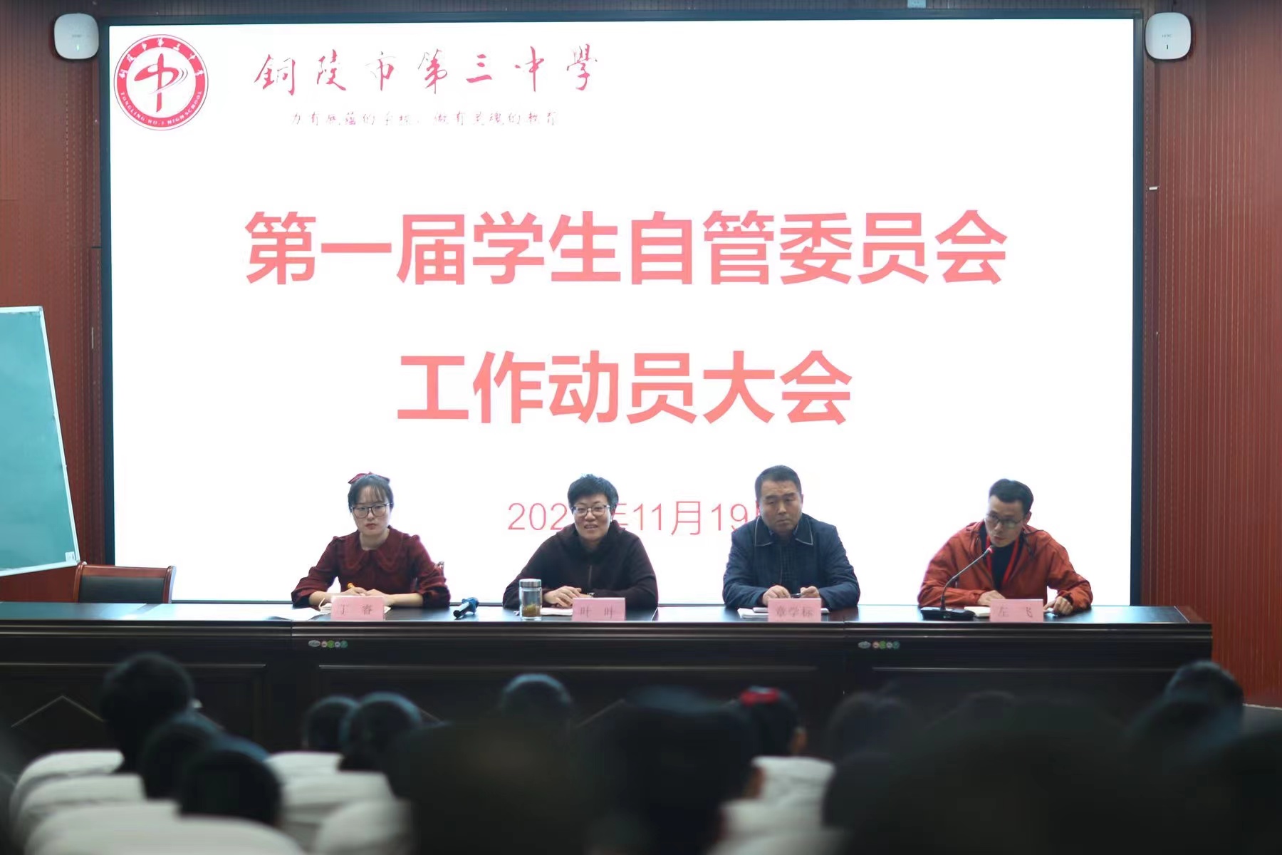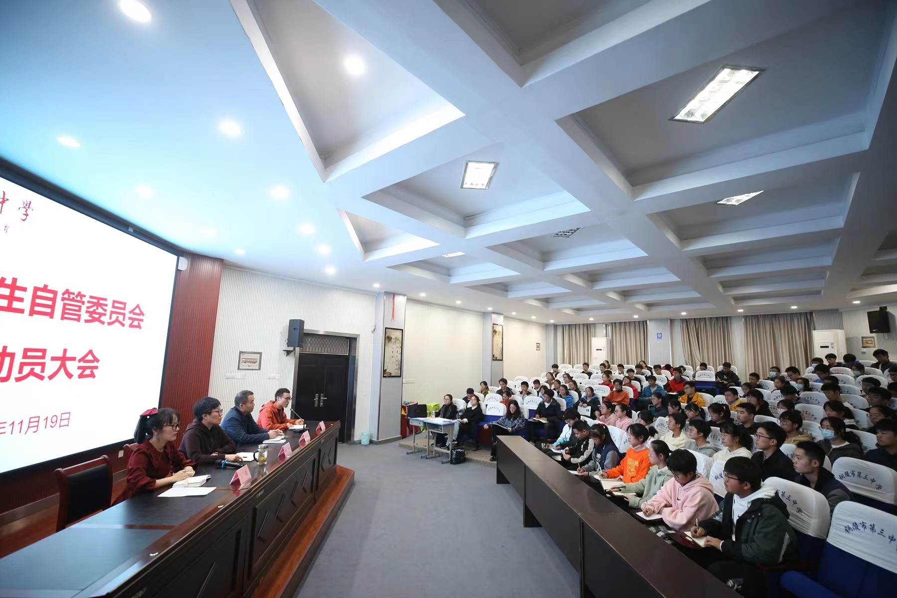 11月19日下午,我校第一屆學(xué)生自管委員會(huì)工作動(dòng)員大會(huì)在校多功能廳召開(kāi),校黨委書(shū)記、校長(zhǎng)葉葉、校黨委委員、政教處主任章學(xué)標(biāo)等參加。會(huì)議由左飛主持。