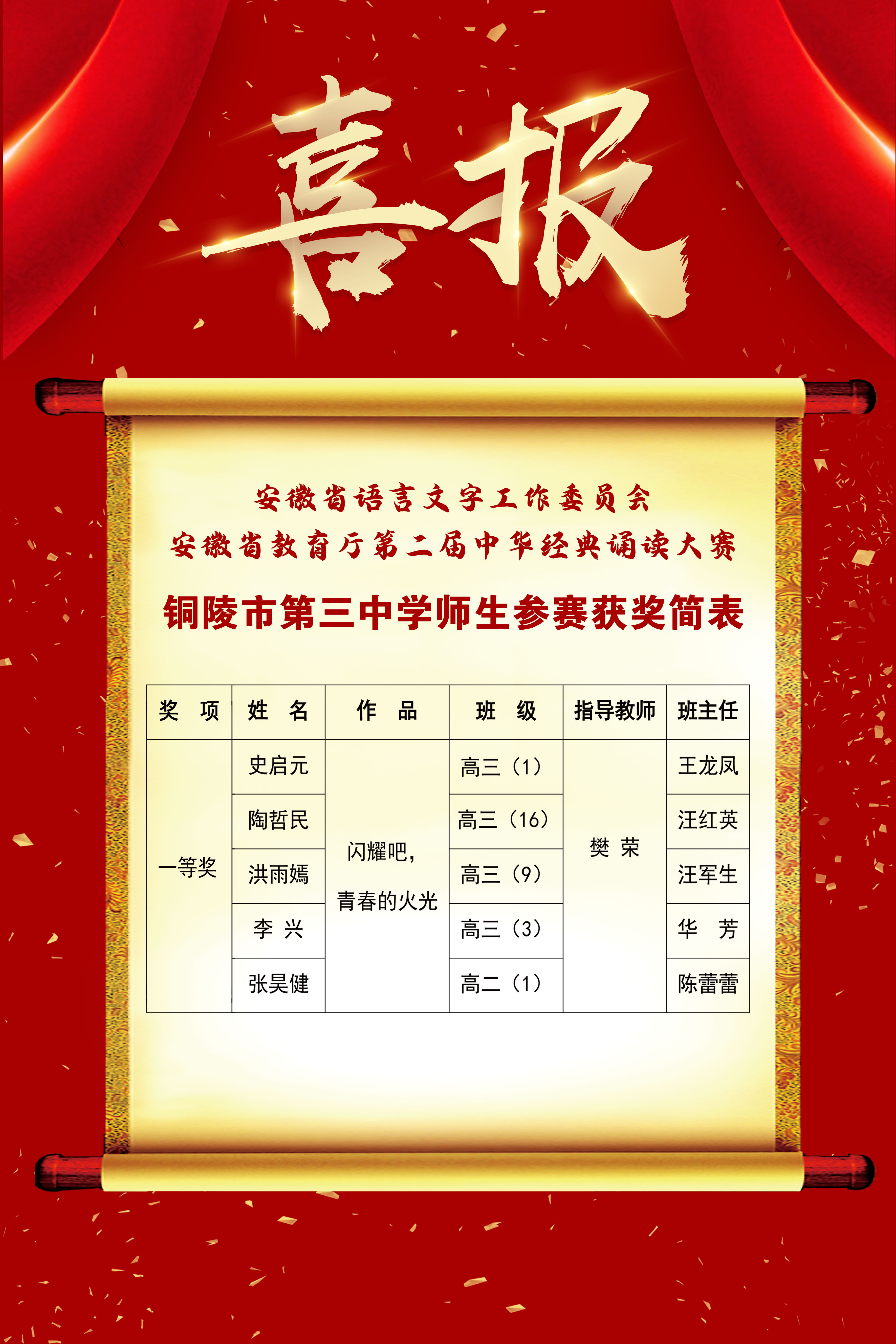 近期,安徽省語言文字工作委員會、安徽省教育廳下發(fā)《關于公布第二屆中華經典誦讀大賽安徽省預選賽獲獎名單的通知》。經省級預選賽組委會專家組對各地各校報送的經典誦讀作品集體評審,我校學生的團隊誦讀作品《閃耀吧,青春的火光》喜獲中學生組一等獎第一名,樊榮老師榮獲“優(yōu)秀指導教師獎”。此次誦讀活動受到校黨委副書記葉葉的高度贊譽,得到參賽學生所在班級班主任的大力支持,師生齊心協(xié)力,精益求精,取得了優(yōu)異的成績。