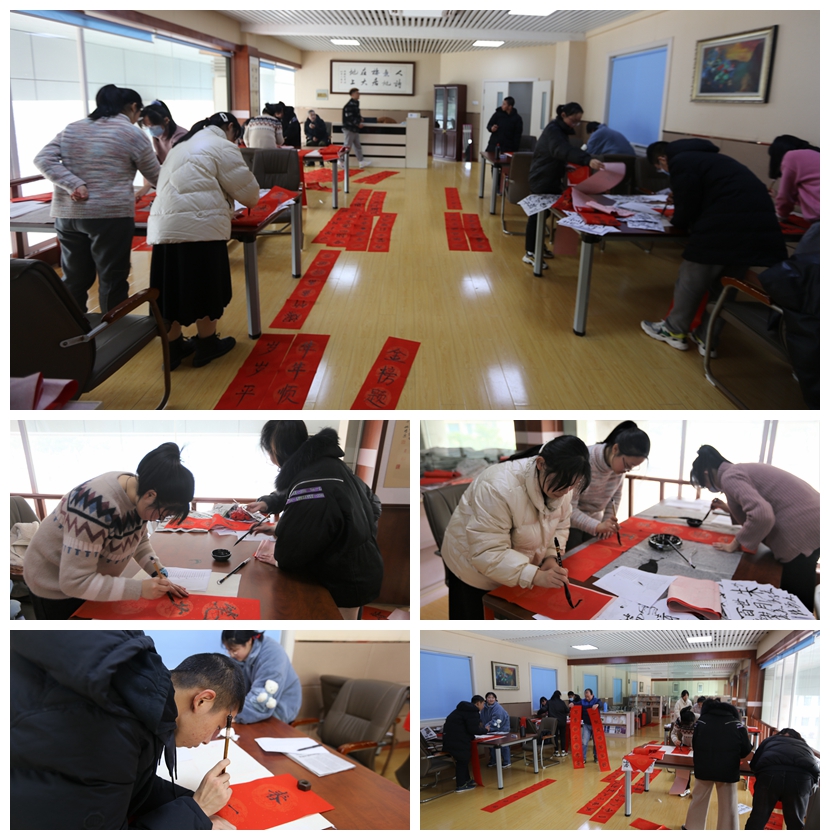 在書寫現(xiàn)場,校工會和團委的老師們早已準備好“文房四寶”,服務(wù)師生們盡情施展!皣┟癜卜晔⑹ 風(fēng)調(diào)雨順頌?zāi)耆A”“有福人家牛報喜 無邊春色燕銜來”“萬事如意滿門順 四季平安全家福”“金牛開出豐收景 喜鵲銜來幸福春”“讀書解困 貓肥家潤”“生活常有喜樂 日子即是福祉 歡喜團圓”......火紅的宣紙上,行云流水之間,一副副翰墨飄香的新春楹聯(lián)”新鮮出爐”,大家紛紛用書法表達對新時代偉大祖國和未來幸福生活的美好祝愿。