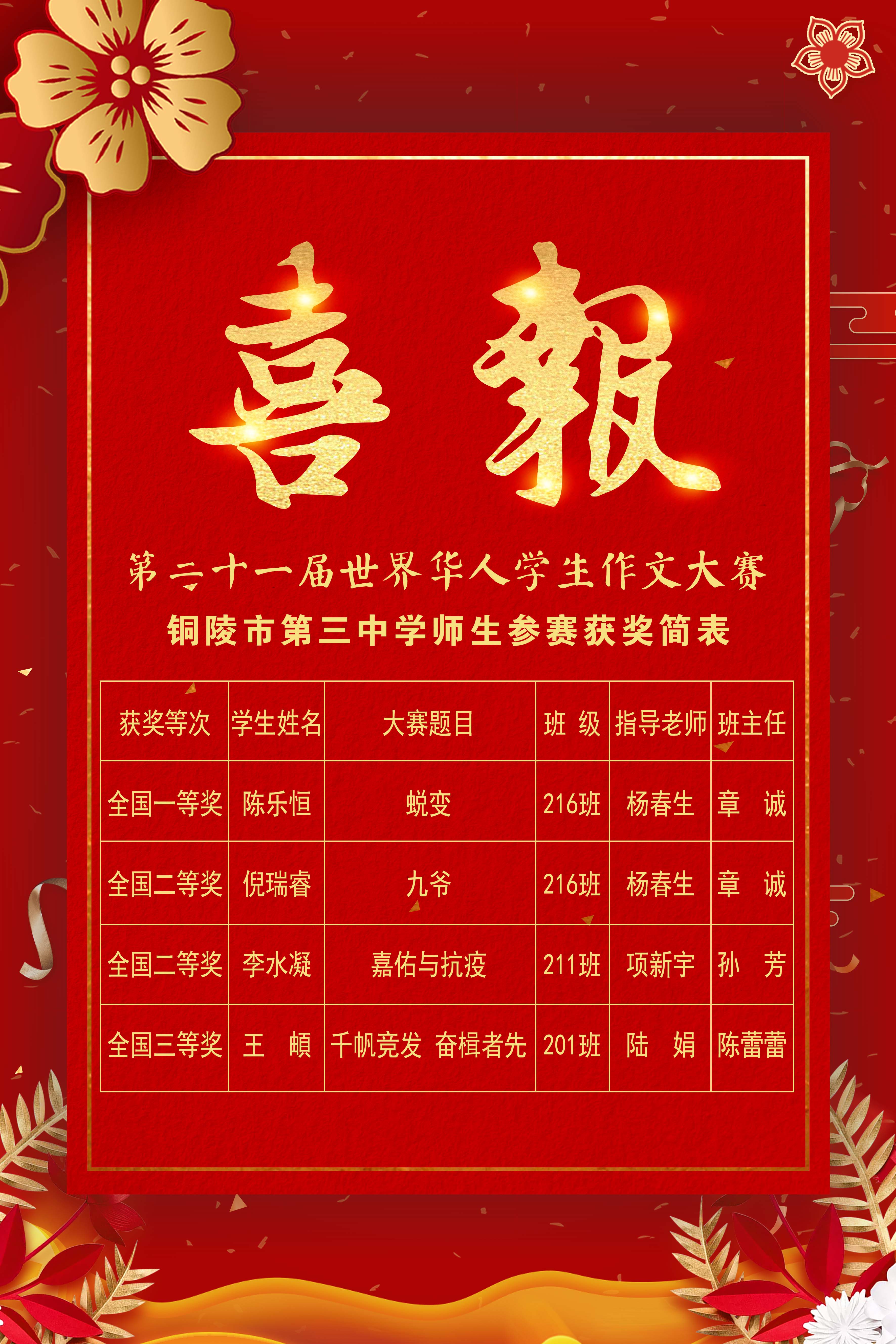 據(jù)悉,第21屆世界華人學生作文大賽是由中華全國歸國華僑聯(lián)合會主辦,教育部認可的全國性競賽活動。參賽過程中,我校高度重視,同學們積極參與,充分展示文學素養(yǎng)和愛國愛鄉(xiāng)情懷,語文組老師們精心指導,班主任也給予大力支持。在此,向獲獎的同學和指導教師、班主任們表示衷心的祝賀。