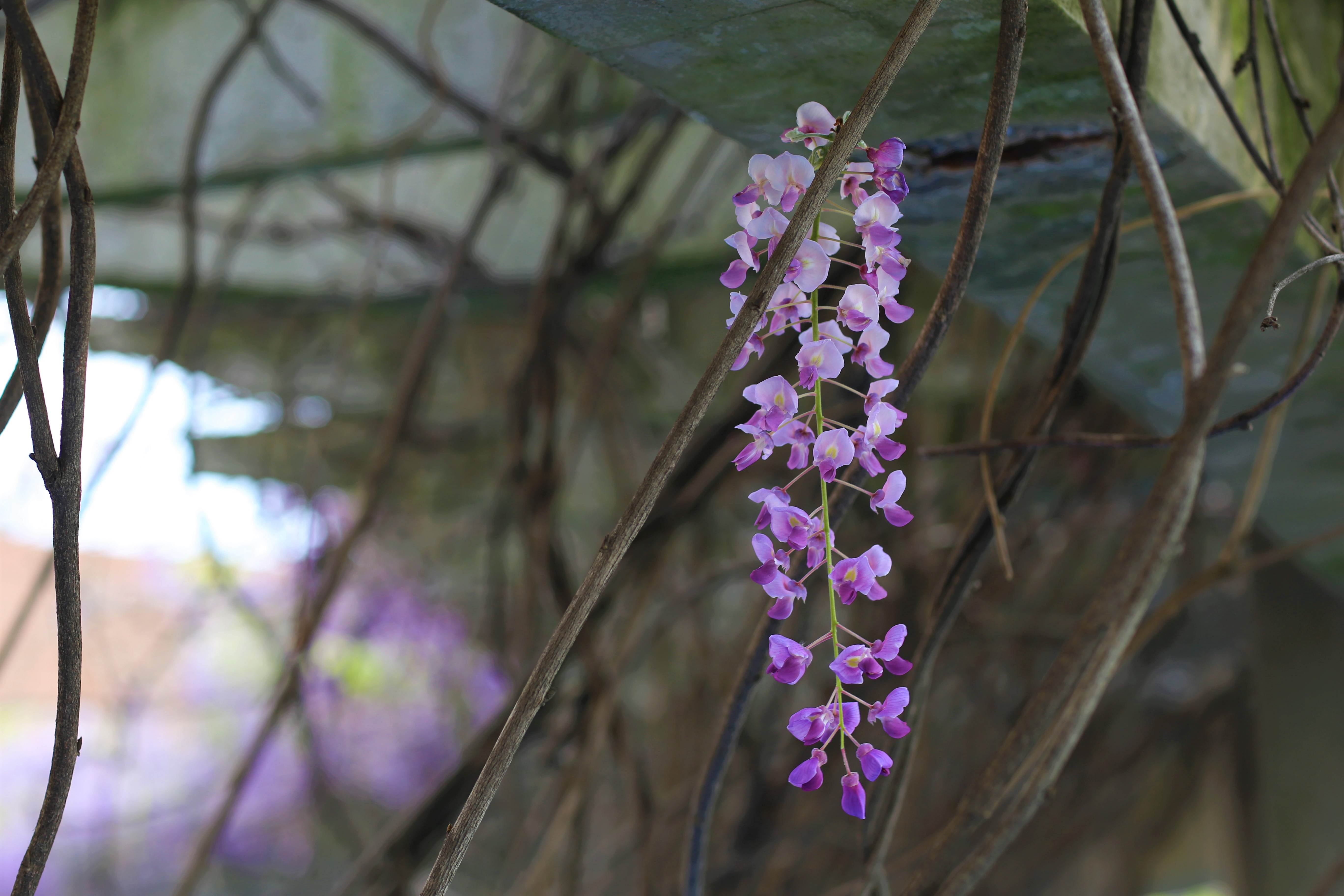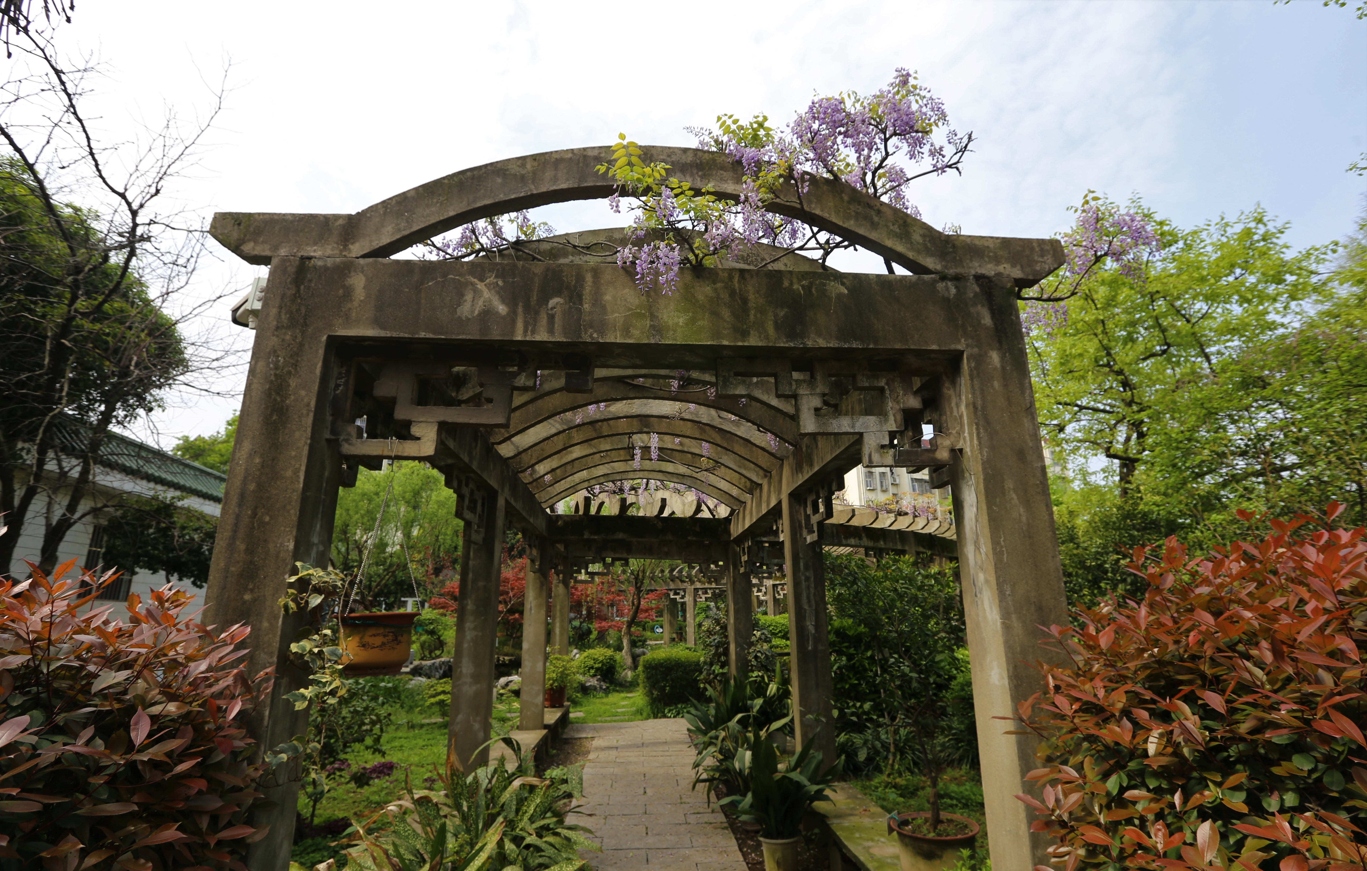 四月,正是紫藤花開季節(jié),三中的紫藤花主要分布在三處,一是生態(tài)館樓頂處,二是植物園長廊,三是植物園盆景園,其中,盆景園的紫藤樹樹齡已經(jīng)有200多年,賞紫藤花,必到三中這三地打卡,三中的紫藤花分時而開,階梯式凋落,四月初,蔓延蜿蜒的藤條上朵朵花開,隨風似紫色波浪般搖擺,一片夢幻的海洋,像畫非畫,如夢非夢,花香沉醉,讓人流連忘返……