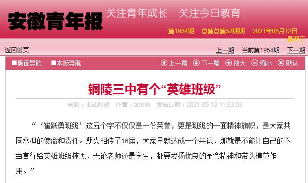 如“崔躍勇班級(jí)”五個(gè)字的字面意思,這是一個(gè)為了紀(jì)念和緬懷崔躍勇而命名的班級(jí)。時(shí)間倒回1979年,崔躍勇從銅陵市第三中學(xué)高中畢業(yè),隨后就讀軍校、參軍,1985年在對(duì)越自衛(wèi)反擊戰(zhàn)中壯烈犧牲。為了紀(jì)念這一優(yōu)秀校友、愛(ài)國(guó)烈士,1987年6月,團(tuán)銅陵市委和銅陵市教育委員會(huì)命名該校七(3)班為“崔躍勇班級(jí)”。34年光陰轉(zhuǎn)瞬即逝,今年清明節(jié),“崔躍勇班級(jí)”榮譽(yù)班旗已經(jīng)傳到了第16屆。